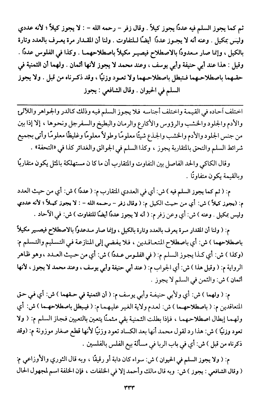 ثم كما يجوز السلم فيه عددا يجوز كيلا. وقال زفر - رَحِمَهُ اللَّهُ -: لا يجوز كيلا؛ لأنه عددي وليس بمكيل. وعنه أنه لا يجوز عددا أيضا للتفاوت. ولنا أن المقدار مرة يعرف بالعدد وتارة بالكيل، وإنما صار معدودا بالاصطلاح فيصير مكيلا باصطلاحهما. وكذا في الفلوس عددا. وقيل: هذا عند أبي حنيفة وأبي يوسف، وعند محمد لا يجوز لأنها أثمان. ولهما أن الثمنية في حقهما باصطلاحهما فتبطل باصطلاحهما ولا تعود وزنيا، وقد ذكرناه من قبل.