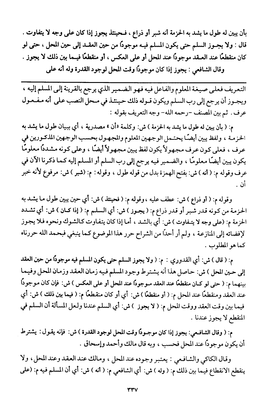 قال: ولا يجوز السلم حتى يكون المسلم فيه موجودا من حين العقد إلى حين المحل، حتى لو كان منقطعا عند العقد موجودا عند المحل أو على العكس، أو منقطعا فيما بين ذلك لا يجوز. وقال الشافعي: يجوز إذا كان موجودا وقت المحل لوجود القدرة وله أنه على