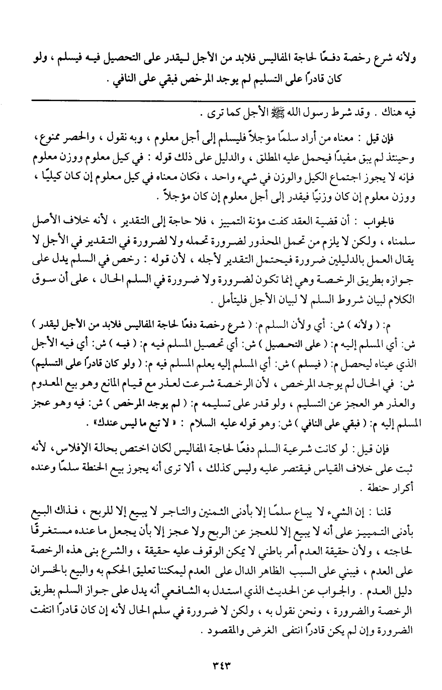 قلنا: إن الشيء لا يباع سلما إلا بأدنى الثمنين والتاجر لا يبيع إلا للربح، فذاك البيع بأدنى التمييز على أنه لا يبيع إلا للعجز عن الربح ولا عجز إلا بأن يجعل ما عنده مستغرقا لحاجته، ولأن حقيقة العدم أمر باطني لا يمكن الوقوف عليه حقيقة، والشرع بنى هذه الرخصة على العدم، فيبني على السبب الظاهر الدال على العدم ليمكننا تعليق الحكم به والبيع بالخسران دليل العدم. والجواب عن الحديث الذي استدل به الشافعي أنه يدل على جواز السلم بطريق الرخصة والضرورة، ونحن نقول به، ولكن لا ضرورة في سلم الحال لأنه إن كان قادرا انتفت الضرورة وإن لم يكن قادرا انتفى الغرض والمقصود.