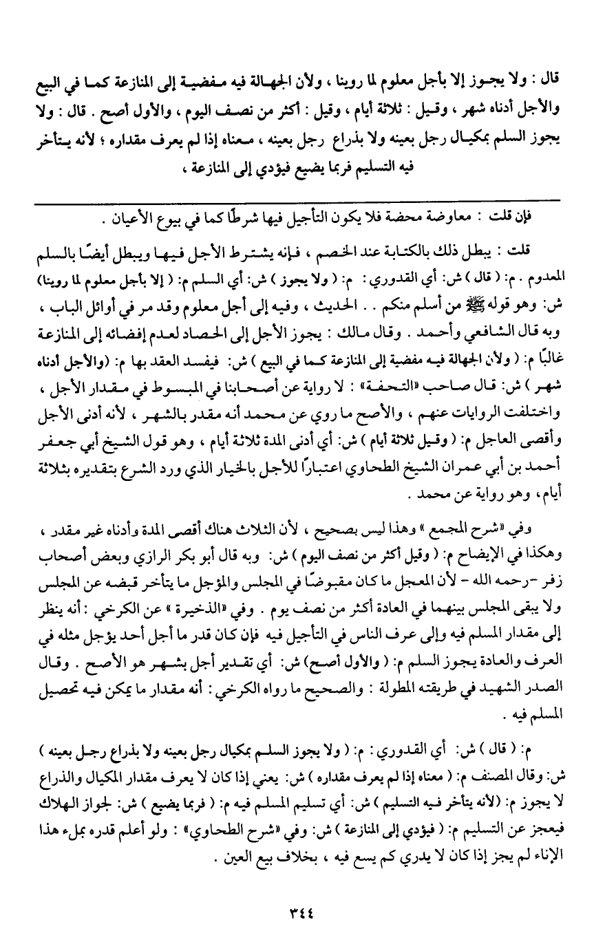 قلت: يبطل ذلك بالكتابة عند الخصم، فإنه يشترط الأجل فيها ويبطل أيضا بالسلم المعدوم. م: (قال) ش: أي القدوري م: (ولا يجوز) ش: أي السلم م: (إلا بأجل معلوم لما روينا) ش: وهو قوله - صَلَّى اللَّهُ عَلَيْهِ وَسَلَّمَ - من أسلم منكم ... الحديث، وفيه إلى أجل معلوم وقد مر في أوائل الباب، وبه قال الشافعي وأحمد. وقال مالك: يجوز الأجل إلى الحصاد لعدم إفضائه إلى المنازعة غالبا م: (ولأن الجهالة فيه مفضية إلى المنازعة كما في البيع) ش: فيفسد العقد بها م: (والأجل أدناه شهر) ش: قال صاحب " التحفة ": لا رواية عن أصحابنا في المبسوط في مقدار الأجل، واختلفت الروايات عنهم، والأصح ما روي عن محمد أنه مقدر بالشهر؛ لأنه أدنى الأجل وأقصى العاجل م: (وقيل ثلاثة أيام) ش: أي أدنى المدة ثلاثة أيام، وهو قول الشيخ أبي جعفر أحمد بن أبي عمران الشيخ الطحاوي اعتبارا للأجل الذي ورد الشرع بتقديره بثلاثة أيام، وهو رواية عن محمد.