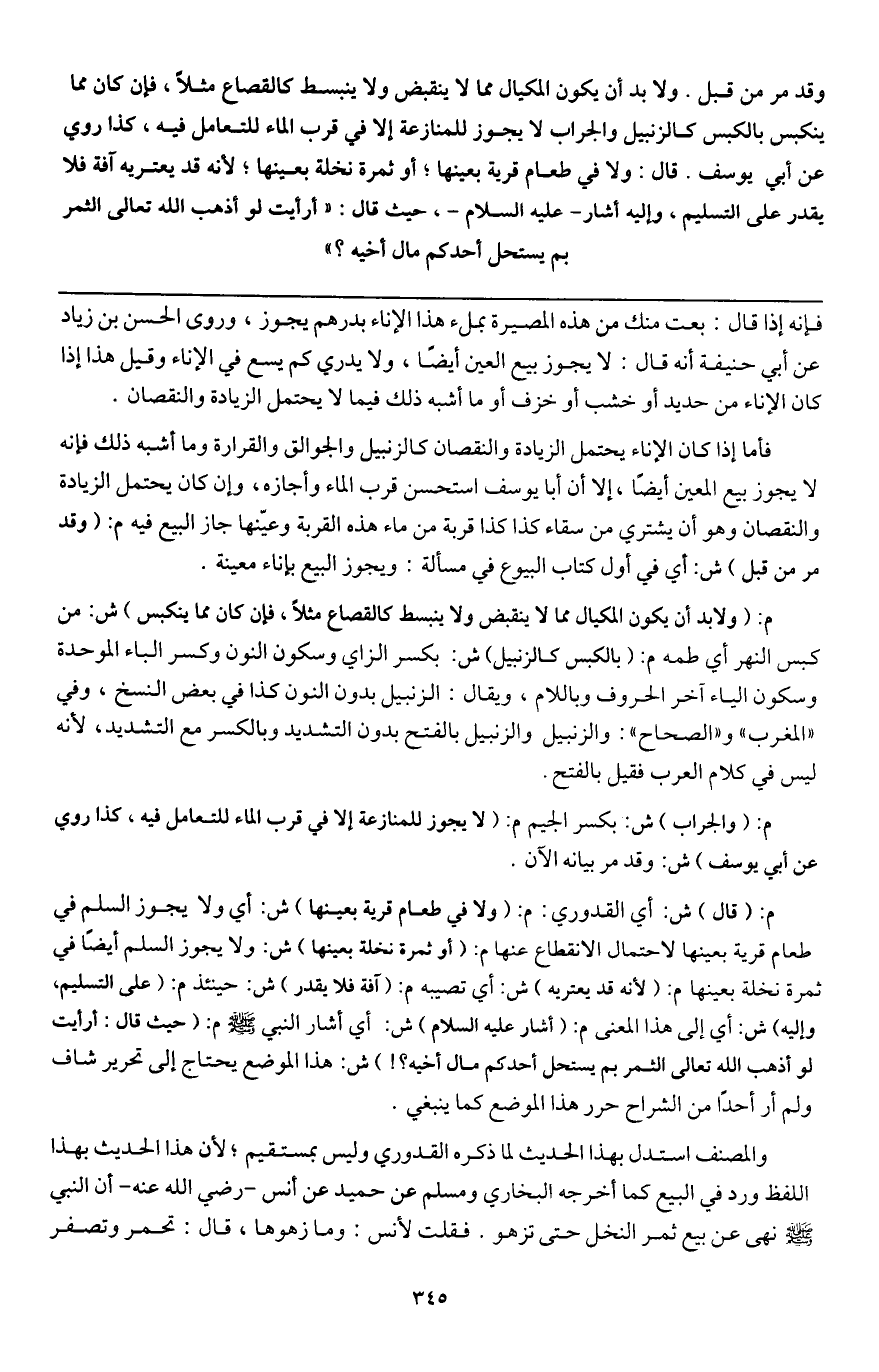 وقد مر من قبل. ولا بد أن يكون المكيال مما لا ينقبض ولا ينبسط كالقصاع مثلا، فإن كان ما ينكبس بالكبس كالزنبيل والجراب لا يجوز للمنازعة إلا في قرب الماء للتعامل فيه، كذا روي عن أبي يوسف. قال: ولا في طعام قرية بعينها؛ أو ثمرة نخلة بعينها؛ لأنه قد يعتريه آفة فلا يقدر على التسليم، وإليه أشار - عَلَيْهِ السَّلَامُ -، حيث قال: «أرأيت لو أذهب الله تعالى الثمر بم يستحل أحدكم مال أخيه؟»