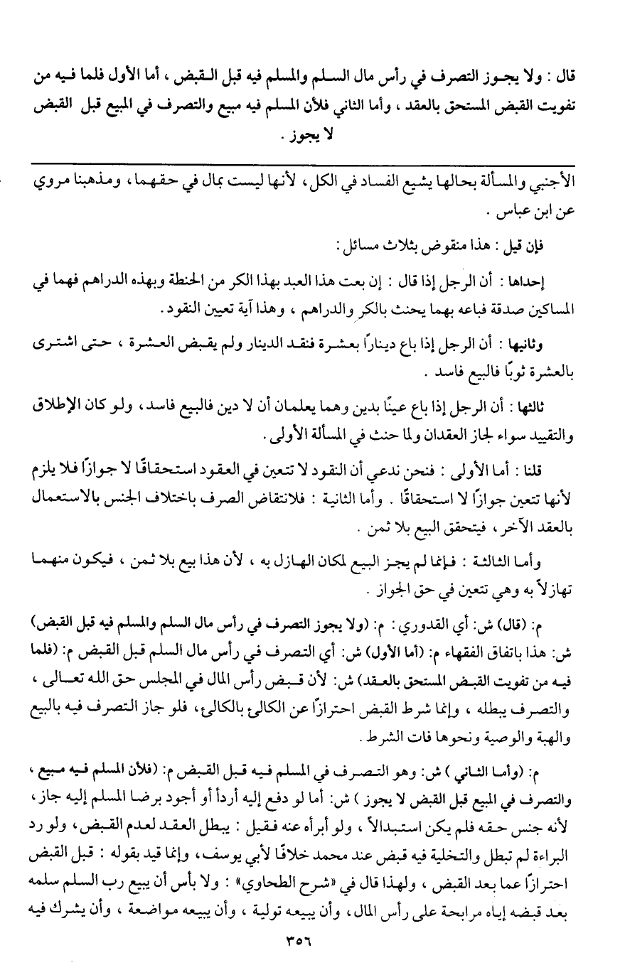 م: (قال) ش: أي القدوري: م: (ولا يجوز التصرف في رأس مال السلم والمسلم فيه قبل القبض) ش: هذا باتفاق الفقهاء م: (أما الأول) ش: أي التصرف في رأس المال السلم قبل القبض م: (فلما فيه من تفويت القبض المستحق بالعقد) ش: لأن قبض رأس المال في المجلس حق الله تعالى، والتصرف يبطله، وإنما شرط القبض احترازا عن الكالئ بالكالئ، فلو جاز التصرف فيه بالبيع والهبة والوصية ونحوها فات الشرط.