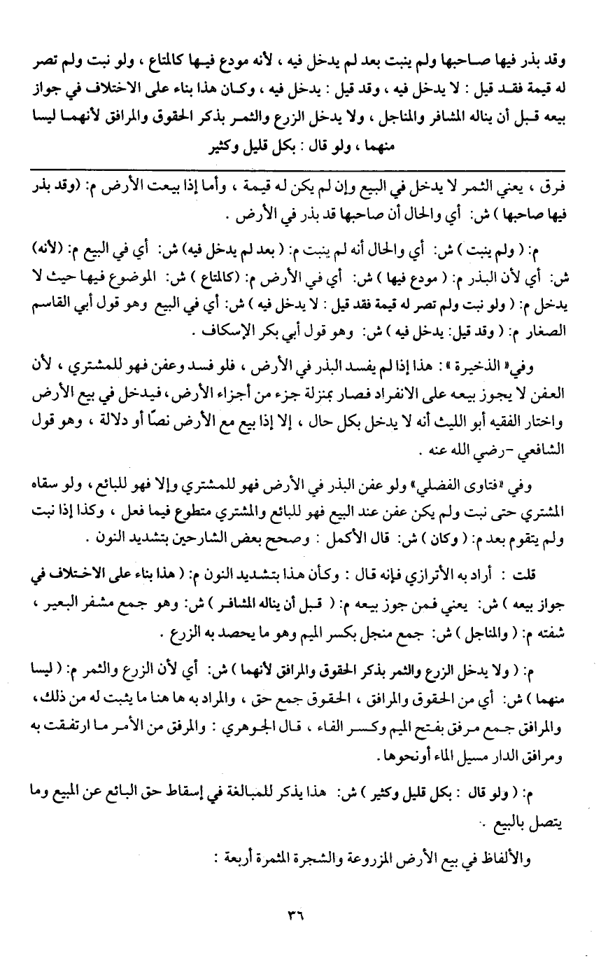 وقد بذر فيها صاحبها ولم ينبت بعد لم يدخل فيه؛ لأنه مودع فيها كالمتاع، ولو نبت ولم تصر له قيمة فقد قيل: لا يدخل فيه، وقد قيل: يدخل فيه، وكان هذا بناء على الاختلاف في جواز بيعه قبل أن يناله المشافر والمناجل، ولا يدخل الزرع والثمر بذكر الحقوق والمرافق؛ لأنهما ليسا منهما، ولو قال: بكل قليل وكثير