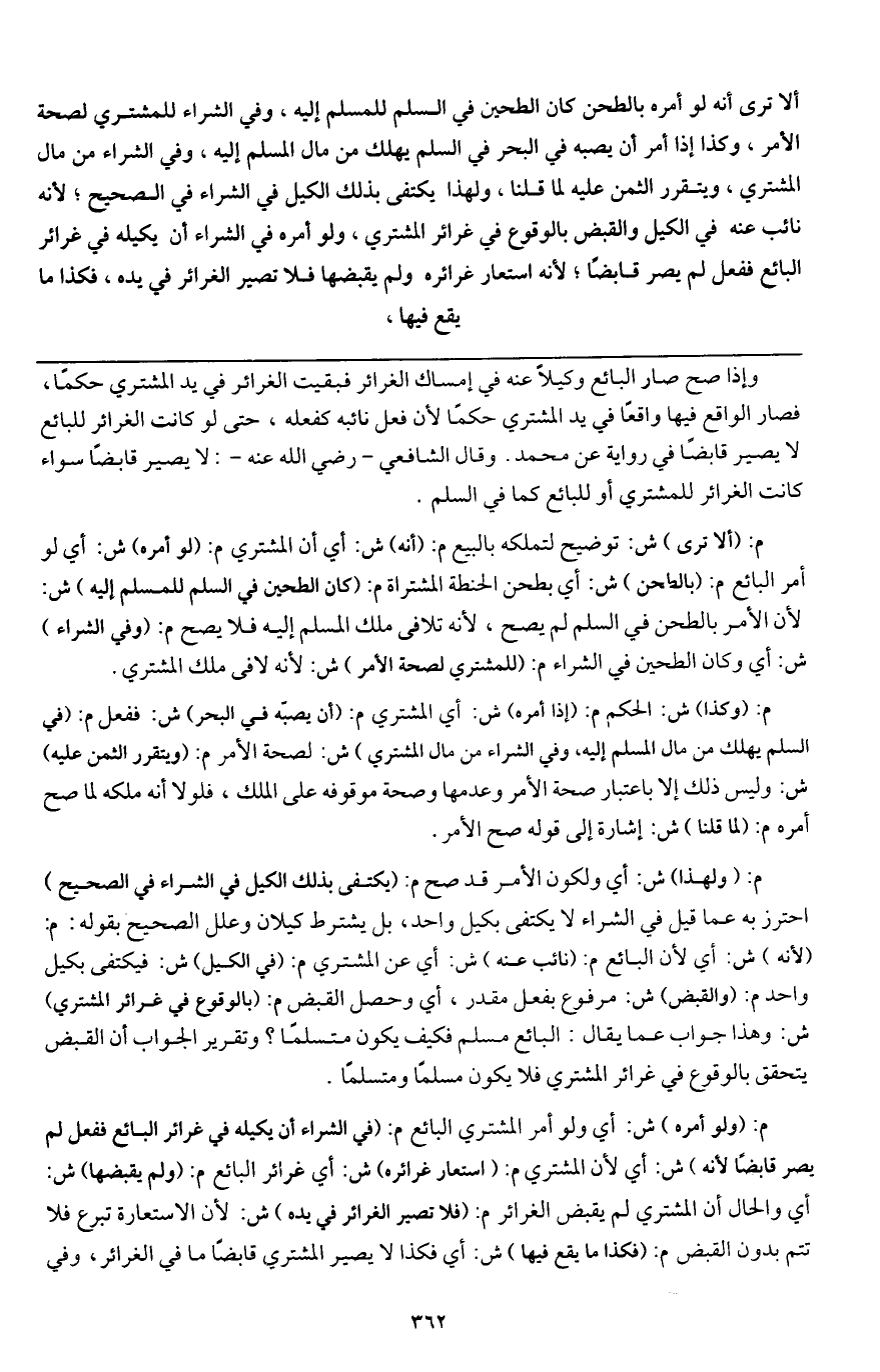 م: (ألا ترى) ش: توضيح لتملكه بالبيع م: (أنه) ش: أي أن المشتري م: (لو أمره) ش: أي لو أمر البائع م: (بالطحن) ش: أي بطحن الحنطة المشتراة م: (كان الطحين في السلم للمسلم إليه) ش: لأن الأمر بالطحن في السلم لم يصح؛ لأنه تلافى ملك المسلم إليه فلا يصح م: (وفي الشراء) ش: أي وكان الطحين في الشراء م: (للمشتري لصحة الأمر) ش: لأنه لافى ملك المشتري.