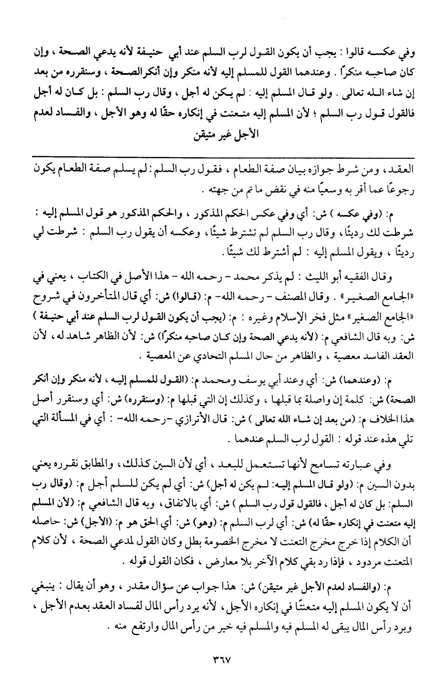 ـــــــــــــــــــــــــــــQالعقد، ومن شرط جوازه بيان صفة الطعام، فقول رب السلم: لم يسلم صفة الطعام يكون رجوعا عما أقر به وسعيا منه في نقض ما تم من جهته.