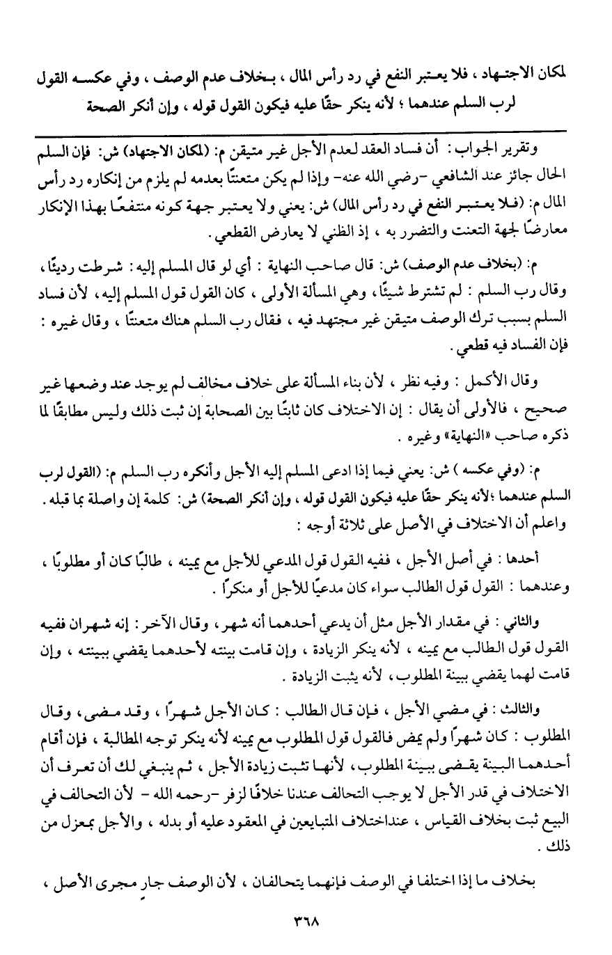 ـــــــــــــــــــــــــــــQوتقرير الجواب: أن فساد العقد لعدم الأجل غير متقين م: (لمكان الاجتهاد) ش: فإن السلم الحال جائز عند الشافعي - رَضِيَ اللَّهُ عَنْهُ - وإذا لم يكن متعنتا بعدمه لم يلزم من إنكاره رد رأس المال م: (فلا يعتبر النفع في رد رأس المال) ش: يعني ولا يعتبر جهة كونه منتفعا بهذا الإنكار معارضا لجهة التعنت والتضرر به، إذ الظني لا يعارض القطعي.