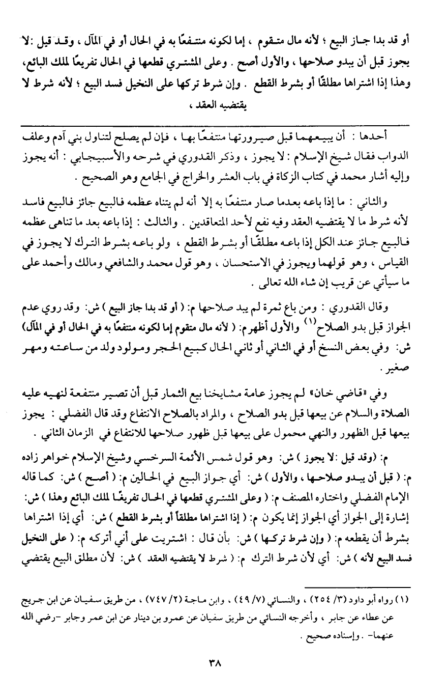 وقال القدوري: ومن باع ثمرة لم يبد صلاحها م: (أو قد بدا جاز البيع) ش: وقد روي عدم الجواز قبل بدو الصلاح والأول أظهر م: (لأنه مال متقوم إما لكونه منتفعا به في الحال أو في المآل) ش: وفي بعض النسخ، أو في الثاني أو ثاني الحال، كبيع الحجر، ومولود ولد من ساعته، ومهر صغير.
