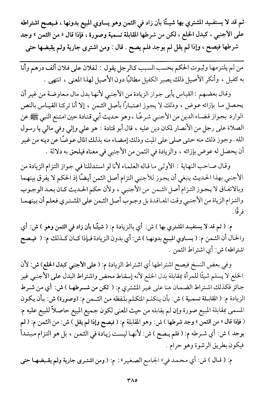ثم قد لا يستفيد المشتري بها شيئا بأن زاد في الثمن وهو يساوي المبيع بدونها، فيصح اشتراطه على الأجنبي، كبدل الخلع، لكن من شرطها المقابلة تسمية وصورة. فإذا قال "من الثمن" وجد شرطها فيصح، وإذا لم يقل لم يوجد فلم يصح.