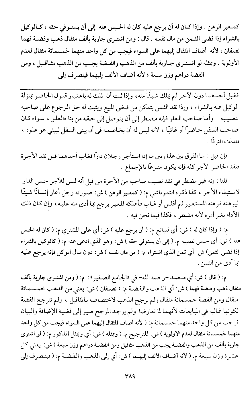م: (قال) ش: أي محمد - رَحِمَهُ اللَّهُ - في " الجامع الصغير ": م: (ومن اشترى جارية بألف مثقال ذهب وفضة فهما) ش: أي الذهب والفضة م: (نصفان) ش: يعني من الذهب خمسمائة مثقال ومن الفضة خمسمائة مثقال ولم يرجح الذهب لاختصاصه بالمثاقيل، ولم تترجح الفضة لكونها غالبة في المبايعات لأنهما لما تعارضا ولم يوجد المرجح صير إلى قضية الإضافة والبيان فوجب من كل واحد منهما خمسمائة. م: (لأنه أضاف المثقال إليهما على السواء فيجب من كل واحد منهما خمسمائة مثقال لعدم الأولوية) ش: للترجيح م: (وبمثله) ش: أي وبمثل المذكور م: (لو اشترى جارية بألف من الذهب والفضة يجب من الذهب مثاقيل ومن الفضة دراهم وزن سبعة) ش: يعني كل عشرة وزن سبعة م: (لأنه أضاف الألف إليهما) ش: أي إلى الذهب والفضة م: (فينصرف إلى