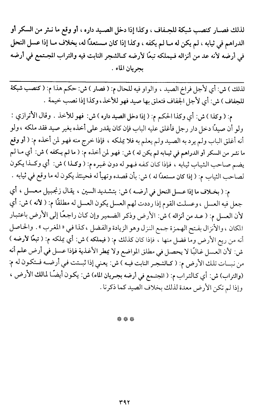 م: (بخلاف ما إذا عسل النحل في أرضه) ش: بتشديد السين، يقال زنجبيل معسل، أي جعل فيه العسل، وعسلت القوم إذا رددت لهم العسل يكون العسل له مطلقا م: (لأنه) ش: أي لأن العسل م: (عد من أنزاله) ش: الأرض وذكر الضمير وإن كان راجعا إلى الأرض باعتبار المكان، والأنزال بفتح الهمزة جمع النزل وهو الزيادة والفضل، كذا في " المغرب ". والحاصل أنه من ريع الأرض وما فضل منها، فإذا كان كذلك م: (فيملكه) ش: أي يملكه م: (تبعا لأرضه) ش: لأن العسل غالبا لا يحصل في مطلق المواضع ولا يمطر الأغذية فإذا عسل في أرض علم أنه من نبات تلك الأرض م: (كالشجر النابت فيه) ش: يعني إذا ثبتت في أرضه فتكون له م: (والتراب) ش: أي كالتراب م: (المجتمع في أرضه بجريان الماء) ش: يكون أيضا لمالك الأرض، وإذا لم تكن الأرض معدة لذلك بخلاف الصيد كما ذكرنا.
