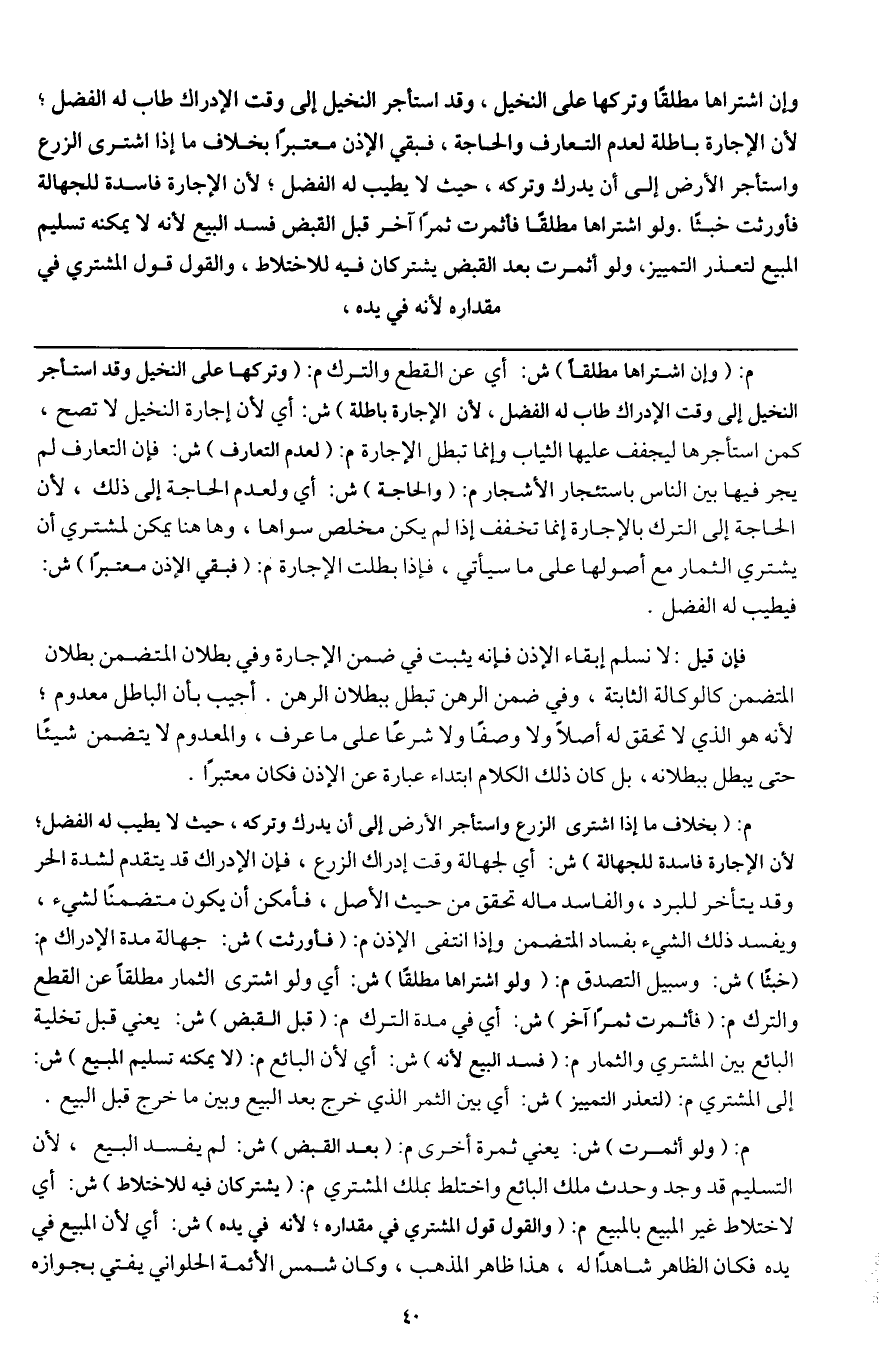 م: (بخلاف ما إذا اشترى الزرع واستأجر الأرض إلى أن يدرك وتركه، حيث لا يطيب له الفضل؛ لأن الإجارة فاسدة للجهالة) ش: أي لجهالة وقت إدراك الزرع، فإن الإدراك قد يتقدم لشدة الحر وقد يتأخر للبرد، والفاسد ما له تحقق من حيث الأصل، فأمكن أن يكون متضمنا لشيء، ويفسد ذلك الشيء بفساد المتضمن، وإذا انتفى الإذن م: (فأورثت) ش: جهالة مدة الإدراك م: (خبثا) ش: وسبيل التصدق م: (ولو اشتراها مطلقا) ش: أي ولو اشترى الثمار مطلقا عن القطع والترك م: فأثمرت ثمرا آخر) ش: أي في مدة الترك م: (قبل القبض) ش: يعني قبل تخلية البائع بين المشتري والثمار م: (فسد البيع؛ لأنه) ش: أي؛ لأن البائع م: (لا يمكنه تسليم المبيع) ش: إلى المشتري م: (لتعذر التمييز) ش: أي بين الثمر الذي خرج بعد البيع وبين ما خرج قبل البيع.