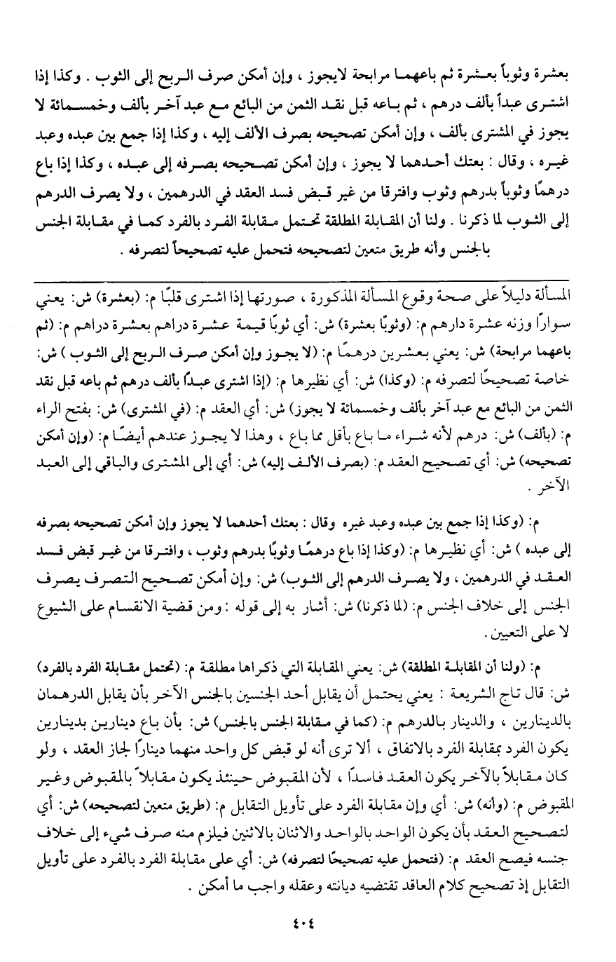 بعشرة وثوبا بعشرة ثم باعهما مرابحة لا يجوز، وإن أمكن صرف الربح إلى الثوب. وكذا إذا اشترى عبدا بألف درهم، ثم باعه قبل نقد الثمن من البائع مع عبد آخر بألف وخمسمائة لا يجوز في المشترى بألف، وإن أمكن تصحيحه بصرف الألف إليه، وكذا إذا جمع بين عبده وعبد غيره، وقال: بعتك أحدهما لا يجوز، وإن أمكن تصحيحه بصرفه إلى عبده، وكذا إذا باع درهما وثوبا بدرهم وثوب وافترقا من غير قبض فسد العقد في الدرهمين، ولا يصرف الدرهم إلى الثوب لما ذكرنا. ولنا أن المقابلة المطلقة تحتمل مقابلة الفرد بالفرد كما في مقابلة الجنس بالجنس، وأنه طريق متعين لتصحيحه فتحمل عليه تصحيحا لتصرفه.