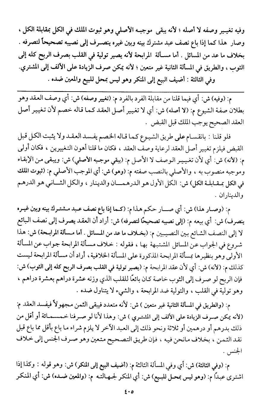 وفيه تغيير وصفه لا أصله؛ لأنه يبقى موجبه الأصلي وهو ثبوت الملك في الكل بمقابلة الكل، وصار هذا كما إذا باع نصف عبد مشترك بينه وبين غيره ينصرف إلى نصيبه تصحيحا لتصرفه. بخلاف ما عد من المسائل. أما مسألة المرابحة لأنه يصير تولية في القلب بصرف الربح كله إلى الثوب، والطريق في المسألة الثانية غير متعين؛ لأنه يمكن صرف الزيادة على الألف إلى المشتري، وفي الثالثة: أضيف البيع إلى المنكر وهو ليس بمحل للبيع والمعين ضده.