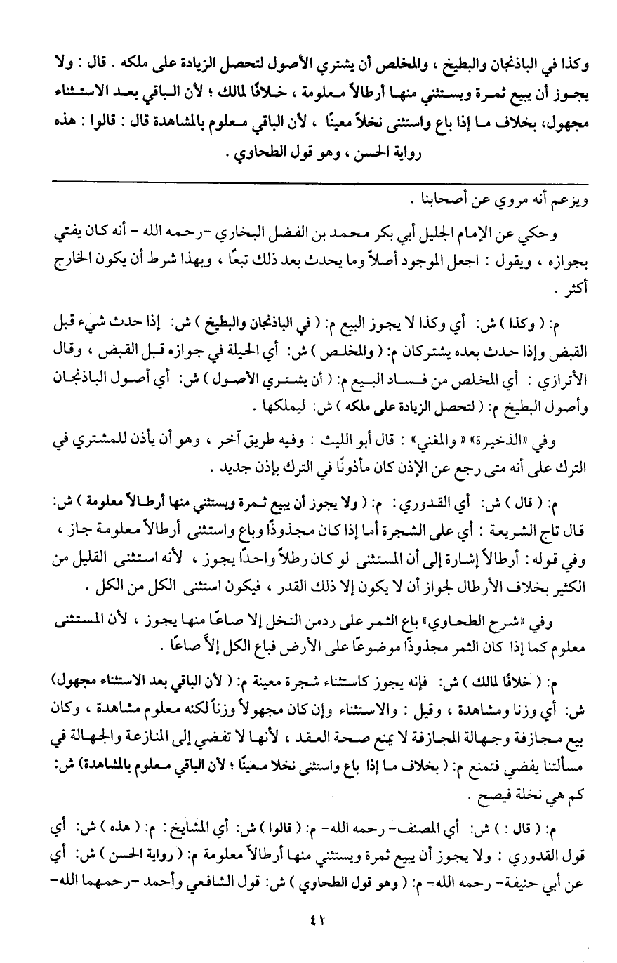 قال: ولا يجوز أن يبيع ثمرة ويستثني منها أرطالا معلومة، خلافا لمالك؛ لأن الباقي بعد الاستثناء مجهول، بخلاف ما إذا باع واستثنى نخلا معينا؛ لأن الباقي معلوم بالمشاهدة، قال: قالوا: هذه رواية الحسن، وهو قول الطحاوي.