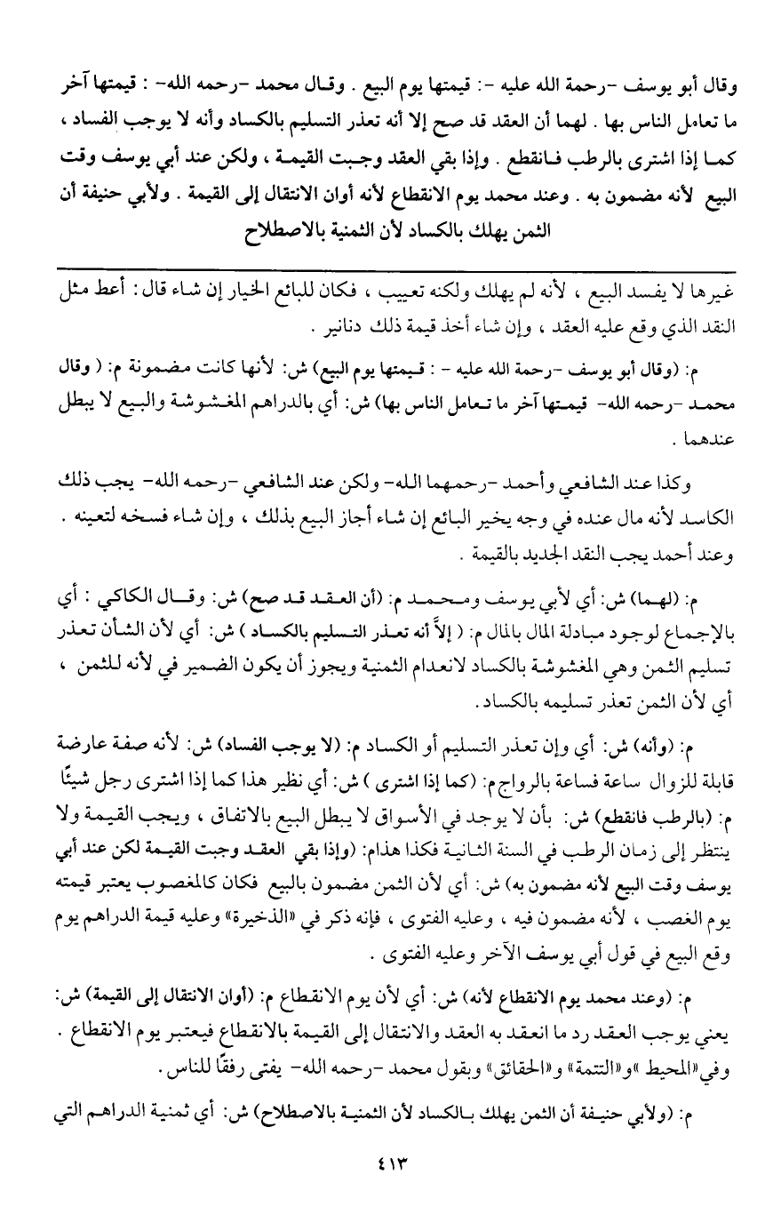 وقال أبو يوسف -رحمة الله عليه-: قيمتها يوم البيع. وقال محمد - رَحِمَهُ اللَّهُ -: قيمتها آخر ما تعامل الناس بها. لهما أن العقد قد صح إلا أنه تعذر التسليم بالكساد وأنه لا يوجب الفساد، كما إذا اشترى بالرطب فانقطع. وإذا بقي العقد وجبت القيمة، ولكن عند أبي يوسف وقت البيع لأنه مضمون به. وعند محمد: يوم الانقطاع؛ لأنه أوان الانتقال إلى القيمة. ولأبي حنيفة: أن الثمن يهلك بالكساد؛ لأن الثمنية بالاصطلاح