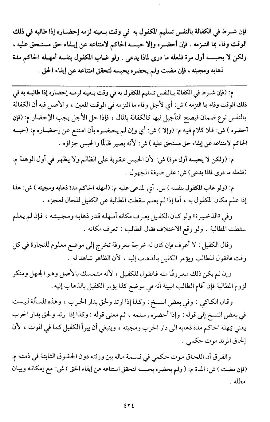 وقال الكاكي: وفي بعض النسخ: وكذا إذا ارتد ولحق بدار الحرب، وهذه المسألة ليست في بعض النسخ إلى قوله: وإذا أحضره وسلمه، ثم معنى قوله: وكذا إذا ارتد ولحق بدار الحرب يعني يمهله الحاكم مدة ذهابه إلى دار الحرب ومجيئه، وينبغي أن يبرأ الكفيل كما في الموت، لأن إلحاق المرتد موت حكمي.