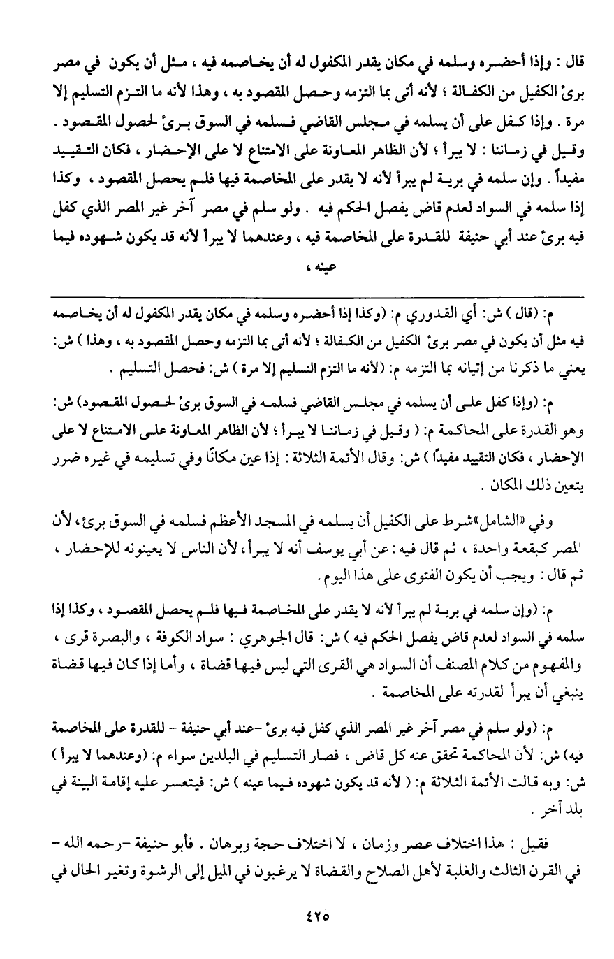 وقيل في زماننا: لا يبرأ؛ لأن الظاهر المعاونة على الامتناع لا على الإحضار، فكان التقييد مفيدا. وإن سلمه في برية لم يبرأ؛ لأنه لا يقدر على المخاصمة فيها فلم يحصل المقصود، وكذا إذا سلمه في السواد لعدم قاض يفصل الحكم فيه. ولو سلم في مصر آخر غير المصر الذي كفل فيه برئ عند أبي حنيفة للقدرة على المخاصمة فيه، وعندهما لا يبرأ لأنه قد يكون شهوده فيما عينه