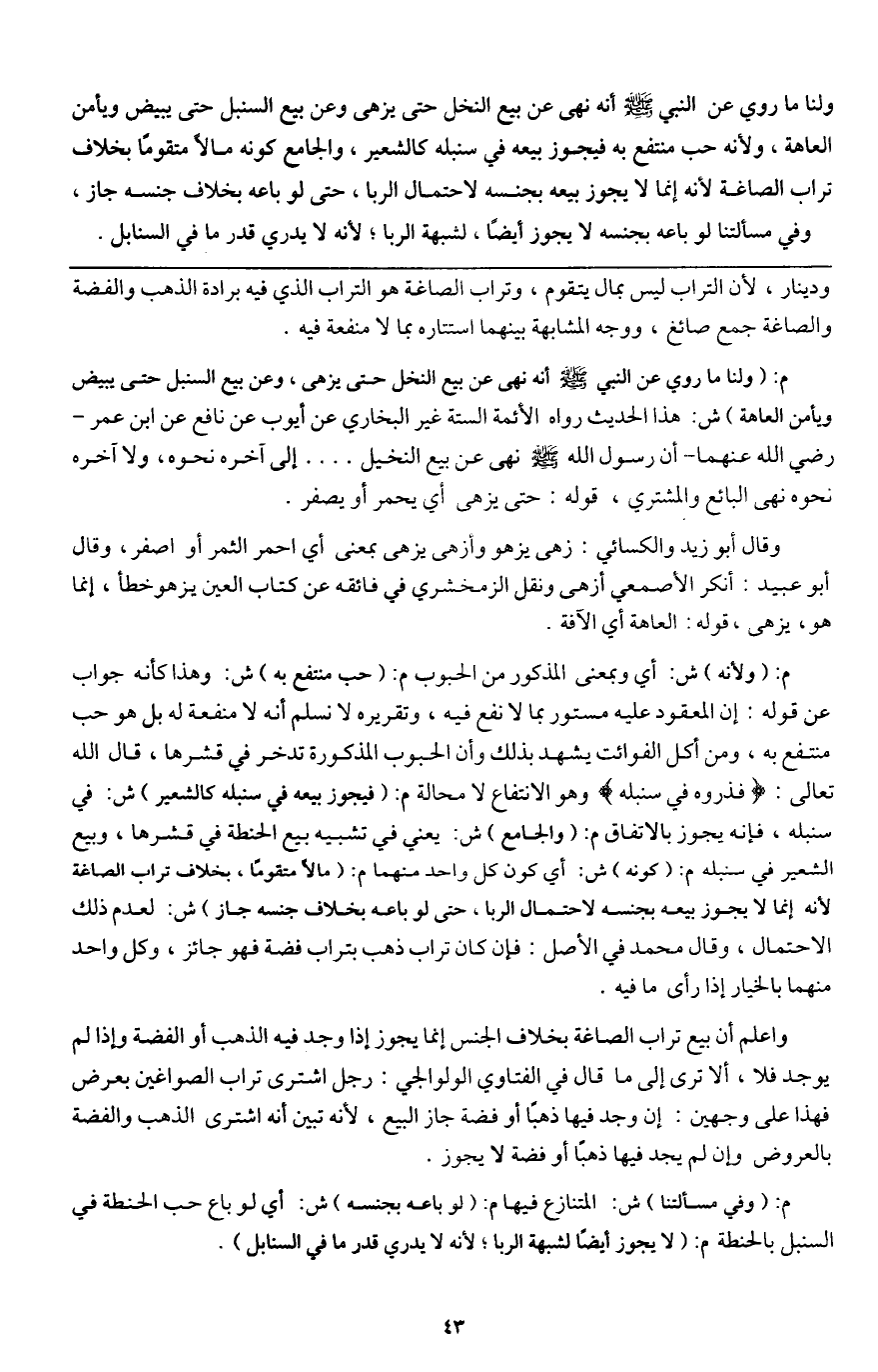 م: (ولأنه) ش: أي وبمعنى المذكور من الحبوب م: (حب منتفع به) ش: وهذا كأنه جواب عن قوله: إن المعقود عليه مستور بما لا نفع فيه، وتقريره لا نسلم أنه لا منفعة له بل هو حب منتفع به، ومن أكل الفوائت يشهد بذلك، وأن الحبوب المذكورة تدخر في قشرها، قال الله تعالى: {فَذَرُوهُ فِي سُنْبُلِهِ} [يوسف: 47] وهو الانتفاع لا محالة م: (فيجوز بيعه في سنبله كالشعير) ش: في سنبله، فإنه يجوز بالاتفاق م: (والجامع) ش: يعني في تشبيه بيع الحنطة في قشرها، وبيع الشعير في سنبله م: (كونه) ش: أي كون كل واحد منهما م: (مالا متقوما، بخلاف تراب الصاغة؛ لأنه إنما لا يجوز بيعه بجنسه لاحتمال الربا، حتى لو باعه بخلاف جنسه جاز) ش: لعدم ذلك الاحتمال، وقال محمد في الأصل: فإن كان تراب ذهب بتراب فضة فهو جائز، وكل واحد منهما بالخيار إذا رأى ما فيه.