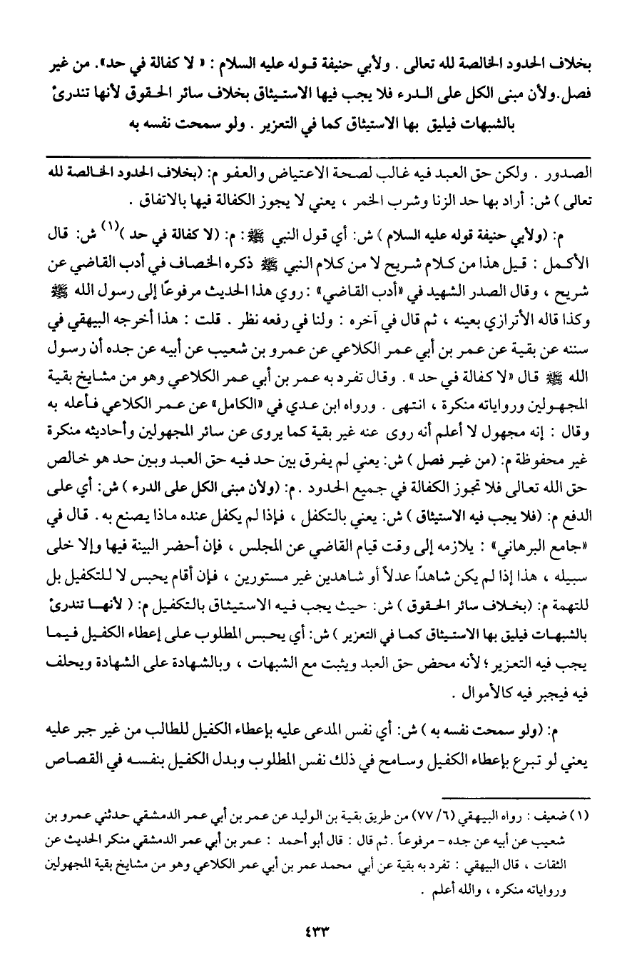 ـــــــــــــــــــــــــــــQالصدور. ولكن حق العبد فيه غالب لصحة الاعتياض والعفو م: (بخلاف الحدود الخالصة لله تعالى) ش: أراد بها حد الزنا وشرب الخمر، يعني لا يجوز الكفالة فيها بالاتفاق.