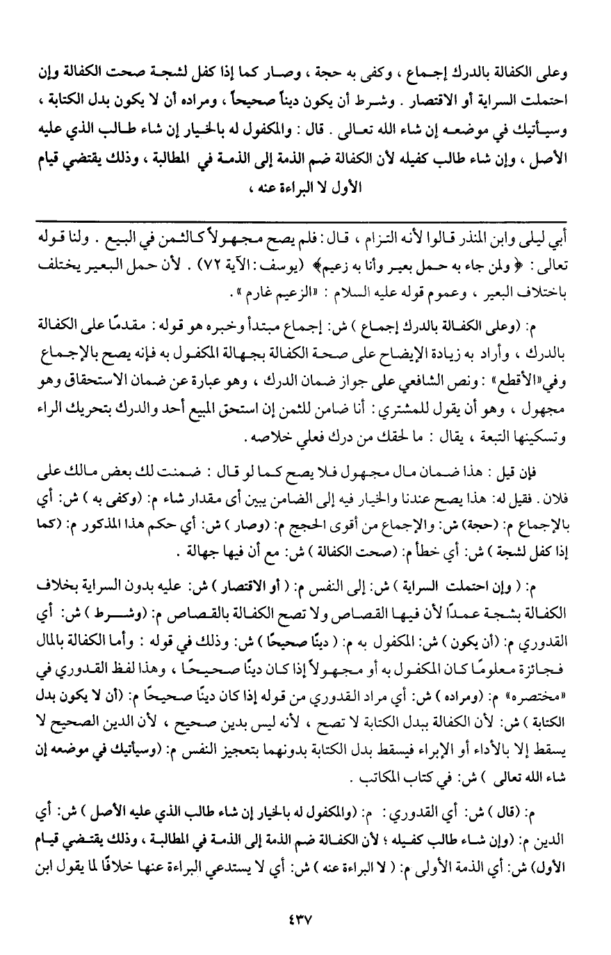 وعلى الكفالة بالدرك إجماع، وكفى به حجة، وصار كما إذا كفل لشجة صحت الكفالة وإن احتملت السراية أو الاقتصار. وشرط أن يكون دينا صحيحا، ومراده أن لا يكون بدل الكتابة، وسيأتيك في موضعه إن شاء الله تعالى. قال: والمكفول له بالخيار إن شاء طالب الذي عليه الأصل، وإن شاء طالب كفيله لأن الكفالة ضم الذمة إلى الذمة في المطالبة، وذلك يقتضي قيام الأول لا البراءة عنه،