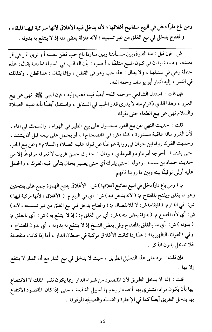 ومن باع دارا دخل في البيع مفاتيح أغلاقها؛ لأنه يدخل فيه الأغلاق؛ لأنها مركبة فيها للبقاء، والمفتاح يدخل في بيع الغلق من غير تسميته؛ لأنه بمنزلة بعض منه إذ لا ينتفع به بدونه.