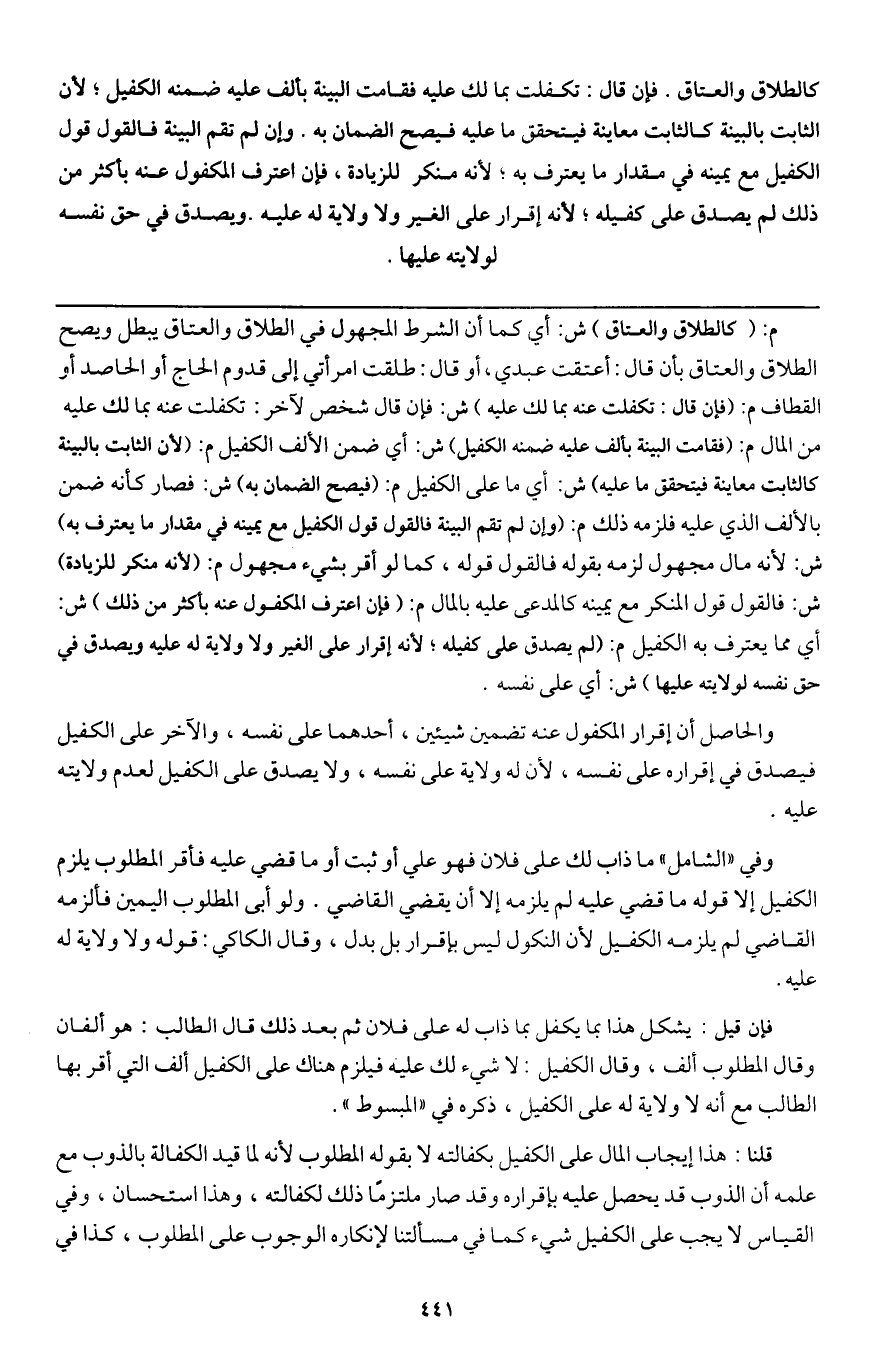 ـــــــــــــــــــــــــــــQم: (كالطلاق والعتاق) ش: أي كما أن الشرط المجهول في الطلاق والعتاق يبطل ويصح الطلاق والعتاق بأن قال: أعتقت عبدي، أو قال: طلقت امرأتي إلى قدوم الحاج أو الحاصد أو القطاف م: (فإن قال: تكفلت عنه بما لك عليه) ش: فإن قال شخص لآخر: تكفلت عنه بما لك عليه من المال م: (فقامت البينة بألف عليه ضمنه الكفيل) ش: أي ضمن الألف الكفيل م: (لأن الثابت بالبينة كالثابت معاينة فيتحقق ما عليه) ش: أي ما على الكفيل م: (فيصح الضمان به) ش: فصار كأنه ضمن بالألف الذي عليه فلزمه ذلك م: (وإن لم تقم البينة فالقول قول الكفيل مع يمينه في مقدار ما يعترف به) ش: لأنه مال مجهول لزمه بقوله فالقول قوله، كما لو أقر بشيء مجهول م: (لأنه منكر للزيادة) ش: فالقول قول المنكر مع يمينه كالمدعى عليه بالمال م: (فإن اعترف المكفول عنه بأكثر من ذلك) ش: أي مما يعترف به الكفيل م: (لم يصدق على كفيله؛ لأنه إقرار على الغير ولا ولاية له عليه ويصدق في حق نفسه لولايته عليها) ش: أي على نفسه.