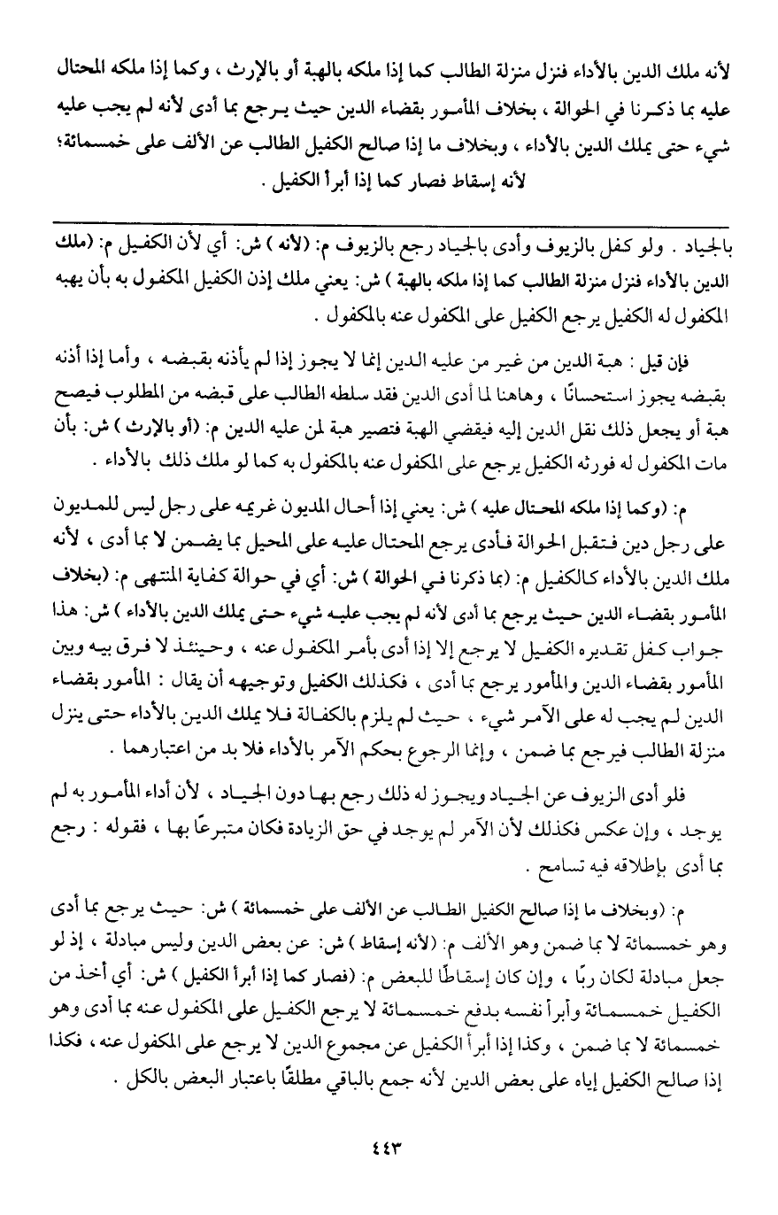 ـــــــــــــــــــــــــــــQبالجياد. ولو كفل بالزيوف وأدى بالجياد رجع بالزيوف م: (لأنه) ش: أي لأن الكفيل م: (ملك الدين بالأداء فنزل منزلة الطالب كما إذا ملكه بالهبة) ش: يعني ملك إذن الكفيل المكفول به بأن يهبه المكفول له الكفيل، يرجع الكفيل على المكفول عنه بالمكفول.