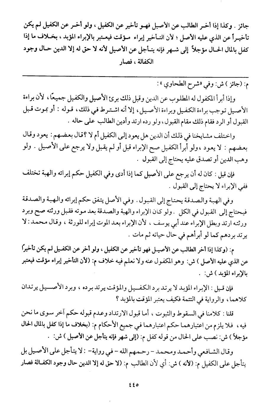 جائز. وكذا إذا أخر الطالب عن الأصيل فهو تأخير عن الكفيل، ولو أخر عن الكفيل لم يكن تأخيرا عن الذي عليه الأصل؛ لأن التأخير إبراء مؤقت فيعتبر بالإبراء المؤبد، بخلاف ما إذا كفل بالمال الحال مؤجلا إلى شهر فإنه يتأجل عن الأصيل لأنه لا حق له إلا الدين حال وجود الكفالة، فصار