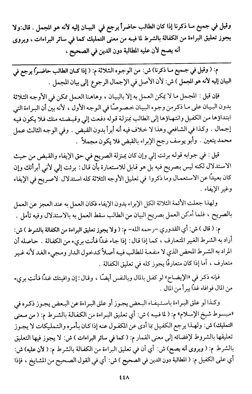 فإن قيل: المجمل ما لا يمكن العمل به إلا بالبيان، وهاهنا العمل ممكن في الأوجه الثلاثة بدون البيان على ما ذكر من وجوه البيان خصوصا في الوجه الأول، لأنه بين أن البراءة التي ابتداؤها من الكفيل وانتهاؤها إلى الطالب بمنزلة قوله دفعت إلي وقبضته منك فلا يكون فيه إجمال. وكذا في الشافعي، وهذا لا خلاف فيه أنه أبرأ بدون القبض. وفي الوجه الثالث عمل محمد يتعين. وأبو يوسف رجح الإبراء بالقبض فلا يكون مجملا.