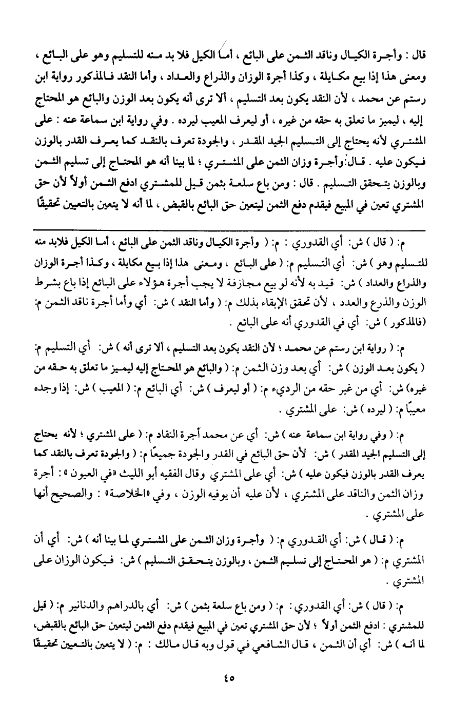 قال: وأجرة الكيال وناقد الثمن على البائع، أما الكيل فلا بد منه للتسليم وهو على البائع، ومعنى هذا إذا بيع مكايلة، وكذا أجرة الوزان والذراع والعداد، وأما النقد فالمذكور رواية ابن رستم عن محمد؛ لأن النقد يكون بعد التسليم، ألا ترى أنه يكون بعد الوزن والبائع هو المحتاج إليه؛ ليميز ما تعلق به حقه من غيره، أو ليعرف المعيب ليرده. وفي رواية ابن سماعة عنه: على المشتري؛ لأنه يحتاج إلى التسليم الجيد المقدر، والجودة تعرف بالنقد كما يعرف القدر بالوزن فيكون عليه. قال: وأجرة وزان الثمن على المشتري؛ لما بينا أنه هو المحتاج إلى تسليم الثمن وبالوزن يتحقق التسليم. قال: ومن باع سلعة بثمن قيل للمشتري ادفع الثمن أولا؛ لأن حق المشتري تعين في المبيع فيقدم دفع الثمن ليتعين حق البائع بالقبض، لما أنه لا يتعين بالتعيين تحقيقا