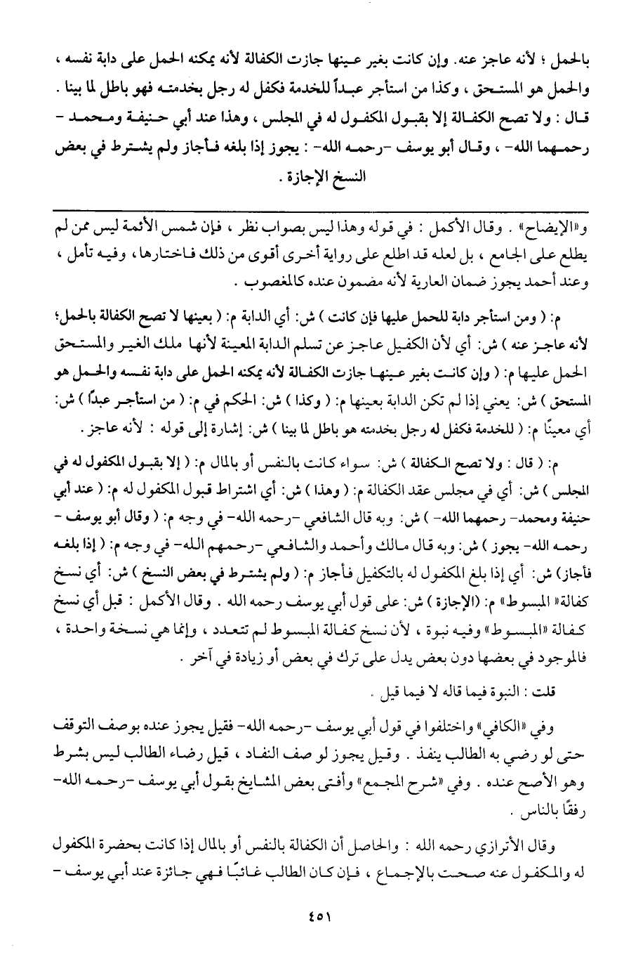 م: (قال: ولا تصح الكفالة) ش: سواء كانت بالنفس أو بالمال م: (إلا بقبول المكفول له في المجلس) ش: أي في مجلس عقد الكفالة م: (هذا) ش: أي اشتراط قبول المكفول له. م: (عند أبي حنيفة ومحمد -رحمهما الله-) ش: وبه قال الشافعي - رَحِمَهُ اللَّهُ - في وجه، م: (وقال أبو يوسف - رَحِمَهُ اللَّهُ - يجوز) ش: وبه قال مالك وأحمد والشافعي - رَحِمَهُمُ اللَّهُ - في وجه م: (إذا بلغه فأجاز) ش: أي إذا بلغ المكفول له بالتكفيل فأجاز م: (ولم يشترط في بعض النسخ) ش: أي نسخ كفالة " المبسوط " م: (الإجازة) ش: على قول أبي يوسف - رَحِمَهُ اللَّهُ -. وقال الأكمل: قبل أي نسخ كفالة " المبسوط "، وفيه نبوة، لأن نسخ كفالة المبسوط لم تتعدد، وإنما هي نسخة واحدة، فالموجود في بعضها دون بعض يدل على ترك في بعض أو زيادة في آخر.
