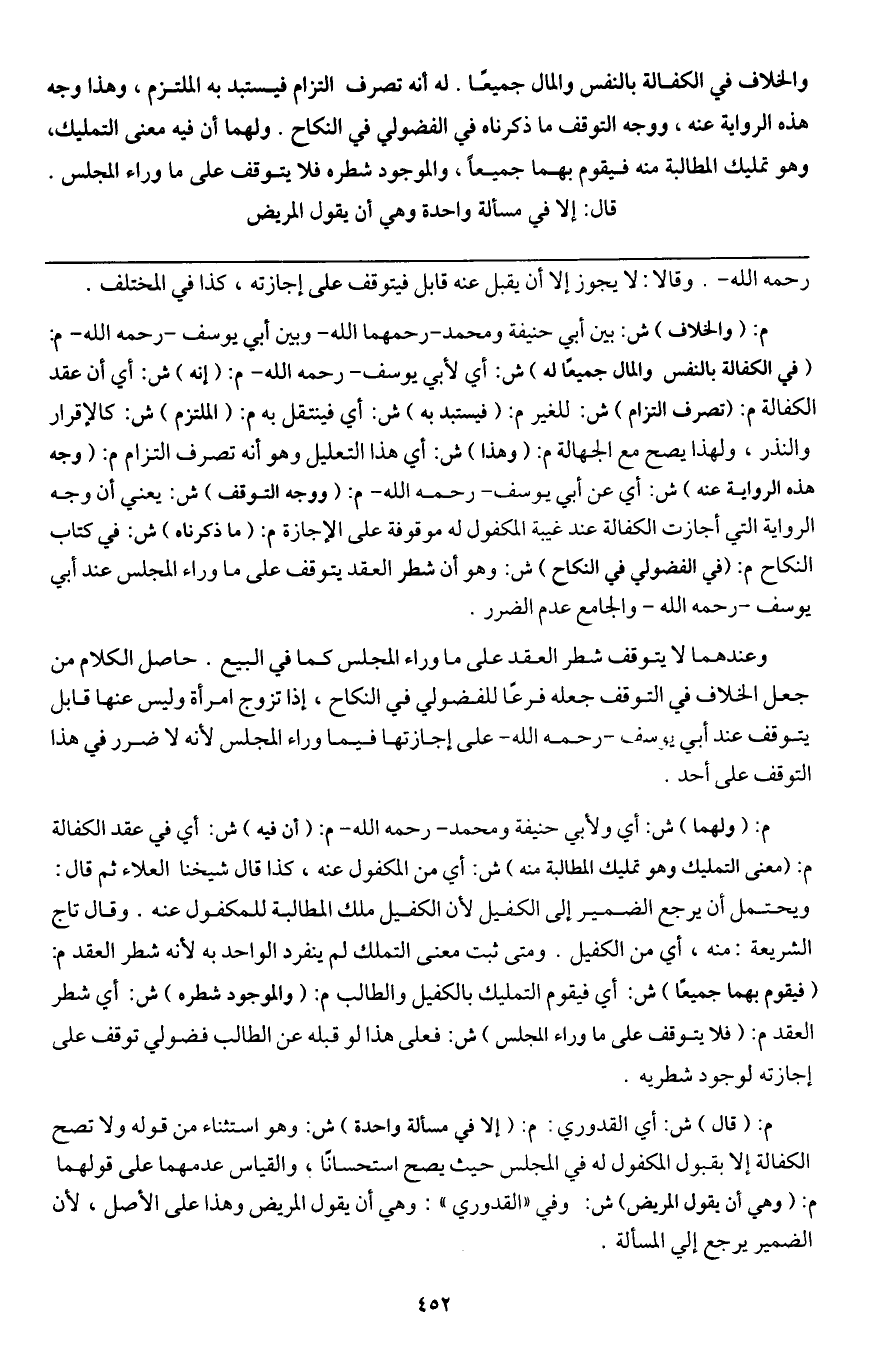 والخلاف في الكفالة بالنفس والمال جميعا. له أنه تصرف التزام فيستبد به الملتزم، وهذا وجه هذه الرواية عنه، ووجه التوقف ما ذكرناه في الفضولي في النكاح. ولهما أن فيه معنى التمليك، وهو تمليك المطالبة منه فيقوم بهما جميعا، والموجود شطره فلا يتوقف على ما رواء المجلس، قال: إلا في مسألة واحدة وهي أن يقول المريض