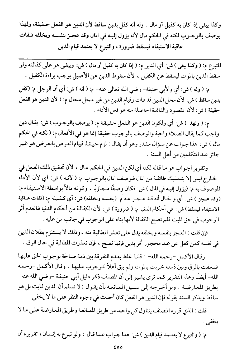 وقال الأكمل - رَحِمَهُ اللَّهُ -: قلنا غلط بعدم التفرقة بين ذمة صالحة بوجوب الحق عليها ضعفت بالرق وبين ذمته خربت بالموت ولم يبق أهلا للوجوب عليها. وقال الأكمل - رَحِمَهُ اللَّهُ - أيضا وهذا التقرير كما ترى يشير إلى أن المصنف ذكر دليل أبي حنيفة - رَضِيَ اللَّهُ عَنْهُ - بطريق المعارضة. ولو أخرجه إلى سبيل الممانعة بأن يقول: لا نسلم أن الدين ثابت بل هو ساقط ويذكر السند بقوله فإن الدين هو الفعل، كان أحدث في وجوه النظر على ما لا يخفى.