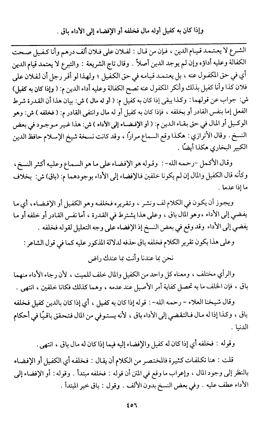 قلت: هنا تكلفات كثيرة، فالمختصر من الكلام أن يقال: فخلفه أي الكفيل أو الإفضاء بالنظر إلى وجود المال، وإعراب ما وقع في المتن أن قوله: فخلفه مبتدأ. وقوله: أو الإفضاء إلى الأداء عطف عليه. وفي بعض النسخ بدون الألف. وقول: باق خبر المبتدأ.
