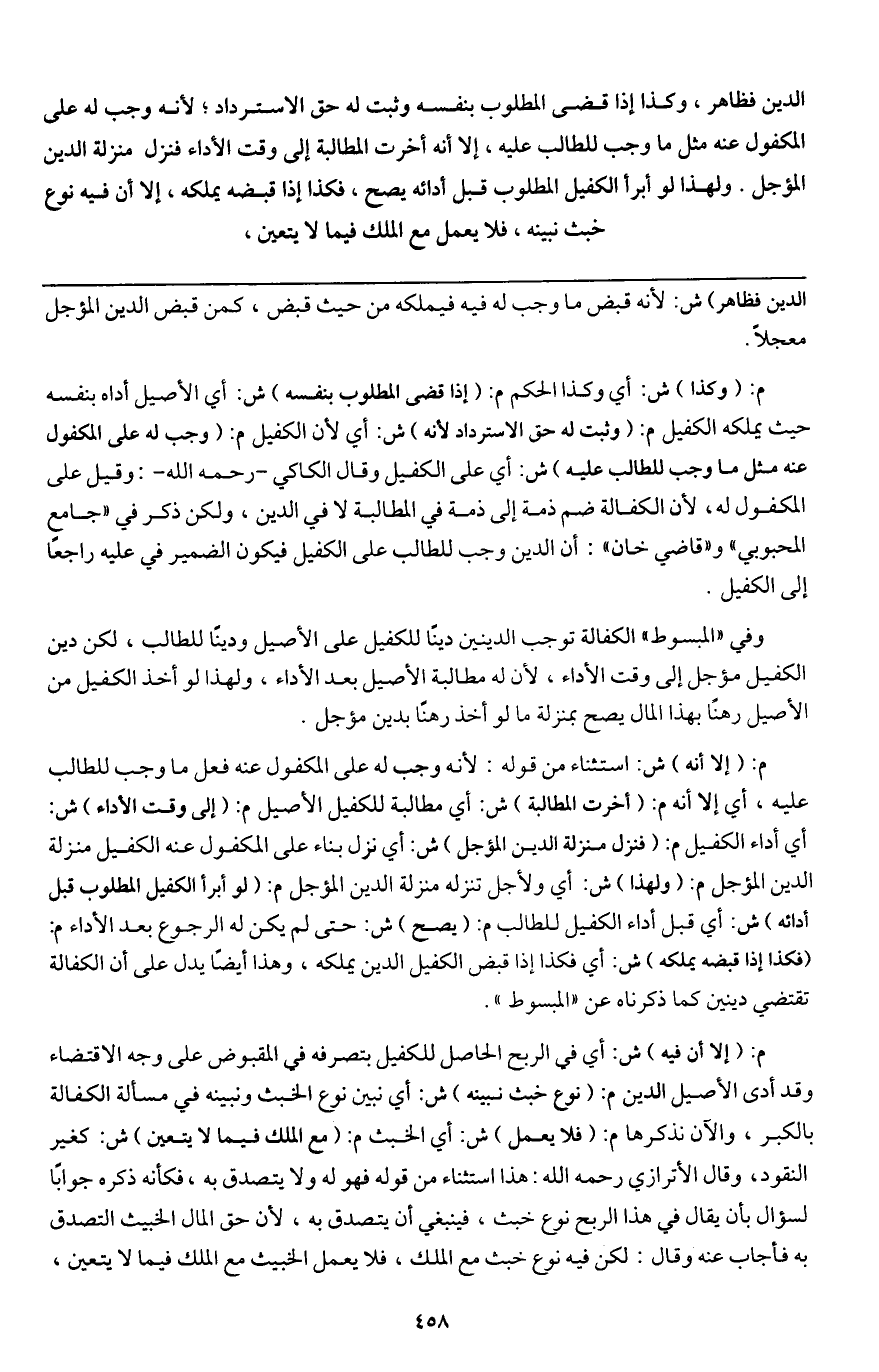 وفي " المبسوط " الكفالة توجب الدينين دينا للكفيل على الأصيل ودينا للطالب، لكن دين الكفيل مؤجل إلى وقت الأداء، لأن له مطالبة الأصيل بعد الأداء، ولهذا لو أخذ الكفيل من الأصيل رهنا بهذا المال يصح بمنزلة ما لو أخذ رهنا بدين مؤجل.