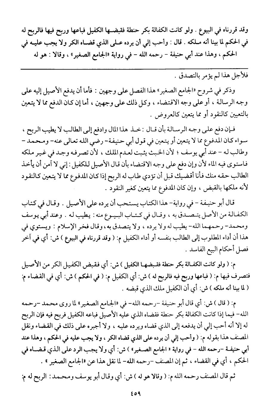 م: (قال) ش: أي قال أبو حنيفة - رَحِمَهُ اللَّهُ - في " الجامع الصغير " لما روى محمد - رَحِمَهُ اللَّهُ - فيما إذا كانت الكفالة بكر حنطة فقضاه الذي عليه الأصيل فباعه الكفيل فربح فيه فإن الربح له إلا أنه أحب إلي أن يدفعه إلى الذي قضاه ويرده عليه، ولا أجبره على ذلك في القضاء ونقل المصنف هذا بقوله م: (وأحب إلي أن يرده على الذي قضاه الكر، ولا يجب عليه في الحكم، وهذا عند أبي حنيفة - رَحِمَهُ اللَّهُ - في رواية " الجامع الصغير ") ش: أي ولا يجب الرد على الذي قضاه في الحكم، أي في القضاء، ثم إن المصنف - رَحِمَهُ اللَّهُ - لما نقل هذا عن " الجامع الصغير ".