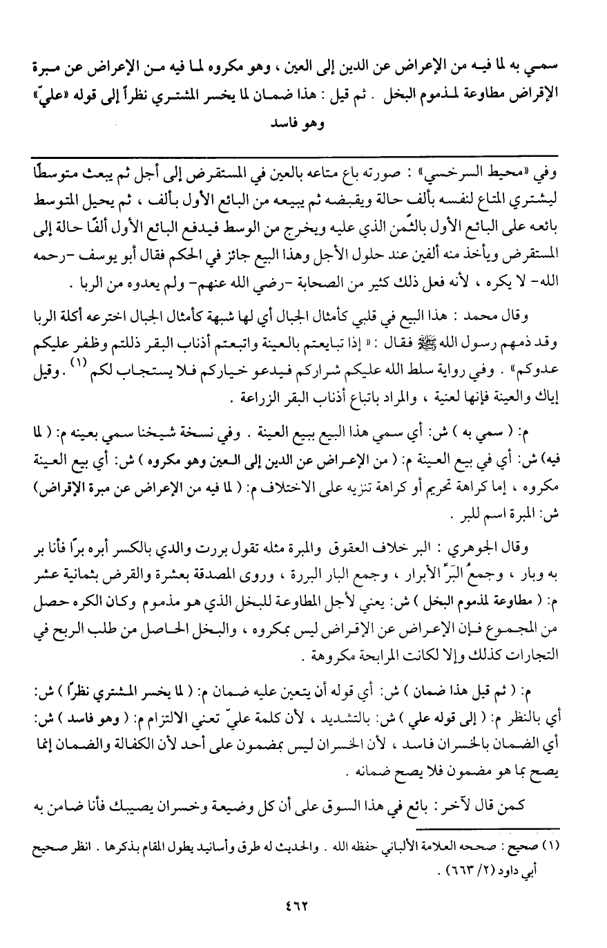 وقال محمد: هذا البيع في قلبي كأمثال الجبال أي لها شبهة كأمثال الجبال اخترعه أكلة الربا وقد ذمهم رسول الله - صَلَّى اللَّهُ عَلَيْهِ وَسَلَّمَ - فقال: «إذا تبايعتم بالعينة واتبعتم أذناب البقر ذللتم وظفر عليكم عدوكم» . وفي رواية: «سلط الله عليكم شراركم فيدعو خياركم فلا يستجاب لكم» . وقيل: إياك والعينة فإنها لعينة، والمراد باتباع أذناب البقر الزراعة.