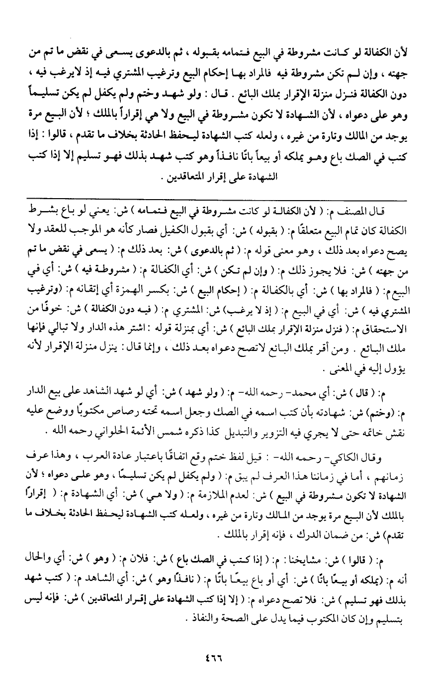 لأن الكفالة لو كانت مشروطة في البيع فتمامه بقبوله، ثم بالدعوى يسعى في نقض ما تم من جهته، وإن لم تكن مشروطة فيه فالمراد بها إحكام البيع وترغيب المشتري فيه إذ لا يرغب فيه، دون الكفالة فنزل منزلة الإقرار بملك البائع. قال: ولو شهد وختم ولم يكفل لم يكن تسليما وهو على دعواه، لأن الشهادة لا تكون مشروطة في البيع ولا هي إقرارا بالملك؛ لأن البيع مرة يوجد من المالك وتارة من غيره، ولعله كتب الشهادة ليحفظ الحادثة بخلاف ما تقدم، قالوا: إذا كتب في الصك باع وهو يملكه أو بيعا باتا نافذا وهو كتب شهد بذلك فهو تسليم إلا إذا كتب الشهادة على إقرار المتعاقدين.