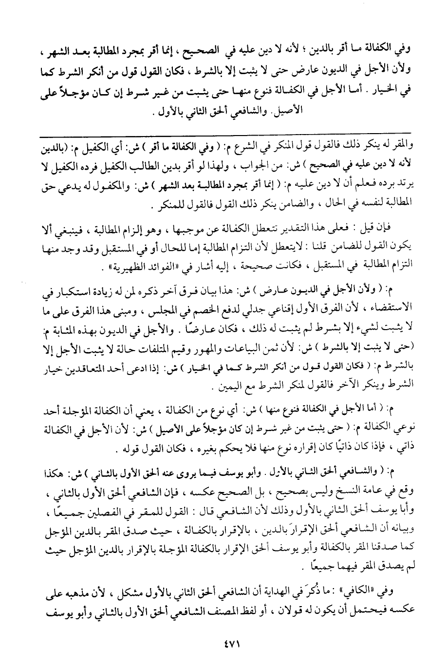 وفي الكفالة ما أقر بالدين؛ لأنه لا دين عليه في الصحيح، إنما أقر بمجرد المطالبة بعد الشهر، ولأن الأجل في الديون عارض حتى لا يثبت إلا بالشرط، فكان القول قول من أنكر الشرط كما في الخيار. أما الأجل في الكفالة فنوع منها حتى يثبت من غير شرط إن كان مؤجلا على الأصيل، والشافعي ألحق الثاني بالأول.
