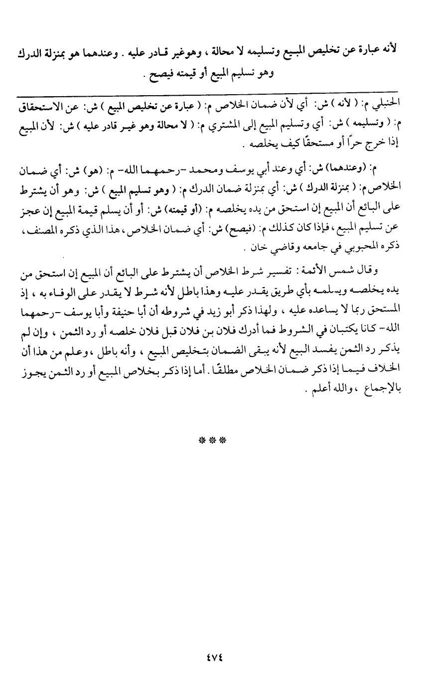 وقال شمس الأئمة: تفسير شرط الخلاص أن يشترط على البائع أن المبيع إن استحق من يده يخلصه ويسلمه بأي طريق يقدر عليه وهذا باطل لأنه شرط لا يقدر عليه الوفاء به، إذ المستحق ربما لا يساعده عليه، ولهذا ذكر أبو زيد في شروطه أن أبا حنيفة وأبا يوسف - رحمهما الله - كانا يكتبان في الشروط: فما أدرك فلان بن فلان قبل فلان خلصه أو رد الثمن، وإن لم يذكر رد الثمن يفسد البيع لأنه يبقى الضمان بتخليص المبيع، وأنه باطل، وعلم من هذا أن الخلاف فيما إذا ذكر ضمان الخلاص مطلقا. أما إذا ذكر بخلاص المبيع أو رد الثمن يجوز بالإجماع، والله أعلم.