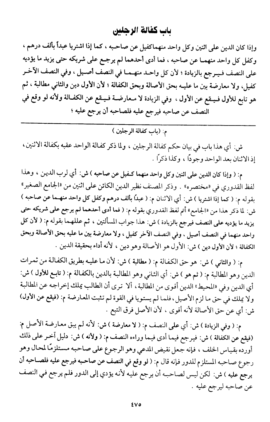 باب كفالة الرجلين وإذا كان الدين على اثنين وكل واحد منهما كفيل عن صاحبه، كما إذا اشتريا عبدا بألف درهم، وكفل كل واحد منهما عن صاحبه، فما أدى أحدهما لم يرجع على شريكه حتى يزيد ما يؤديه على النصف فيرجع بالزيادة؛ لأن كل واحد منهما في النصف أصيل، وفي النصف الآخر كفيل، ولا معارضة بين ما عليه بحق الأصالة وبحق الكفالة؛ لأن الأول دين والثاني مطالبة، ثم هو تابع للأول فيقع عن الأول، وفي الزيادة لا معارضة فيقع عن الكفالة ولأنه لو وقع في النصف عن صاحبه فيرجع عليه فلصاحبه أن يرجع عليه.