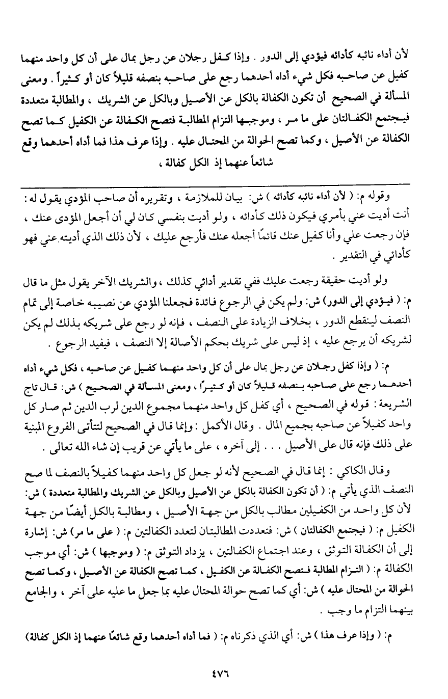 لأن أداء نائبه كأدائه فيؤدي إلى الدور، وإذا كفل رجلان عن رجل بمال على أن كل واحد منهما كفيل عن صاحبه فكل شيء أداه أحدهما رجع على صاحبه بنصفه قليلا كان أو كثيرا. ومعنى المسألة في الصحيح أن تكون الكفالة بالكل عن الأصيل وبالكل عن الشريك، والمطالبة متعددة فيجتمع الكفالتان على ما مر، وموجبها التزام المطالبة فتصح الكفالة عن الكفيل كما تصح الكفالة عن الأصيل، وكما تصح الحوالة من المحتال عليه. وإذا عرف هذا فما أداه أحدهما وقع شائعا عنهما، إذ الكل كفالة.