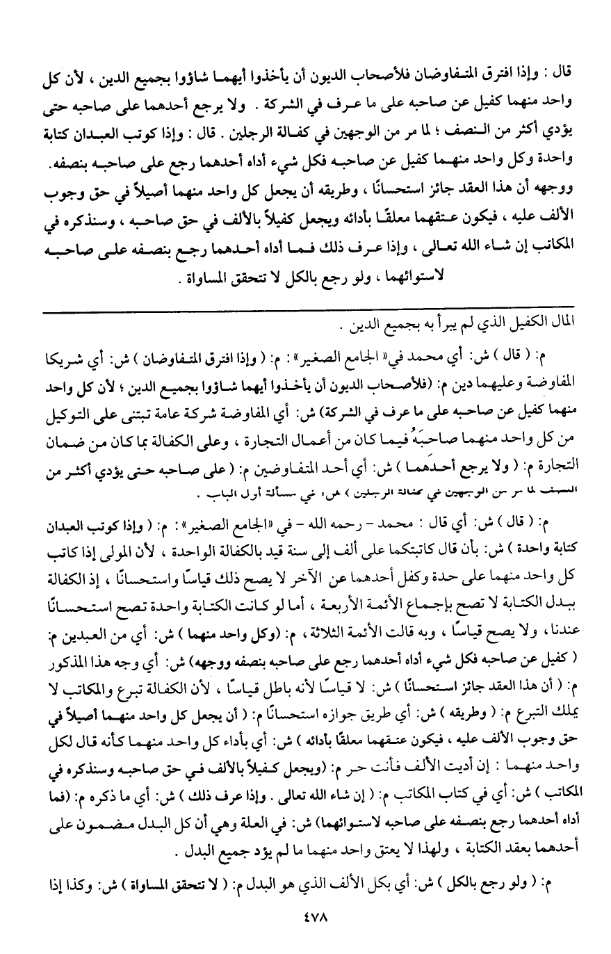 م: (قال) ش: أي محمد في " الجامع الصغير " م: وإذا افترق المتفاوضان) ش: أي شريكا المفاوضة وعليهما دين م: (فلأصحاب الديون أن يأخذوا أيهما شاءوا بجميع الدين، لأن كل واحد منهما كفيل عن صاحبه على ما عرف في الشركة) ش: أي المفاوضة شركة عامة تُبتنى على التوكيل من كل واحد منهما صاحبه فيما كان من أعمال التجارة، وعلى الكفالة بما كان من ضمان التجارة م: (ولا يرجع أحدهما) ش: أي أحد المتفاوضين م: (على صاحبه حتى يؤدي أكثر من النصف لما مر من الوجهين في كفالة الرجلين) ش: في مسألة أول الباب.