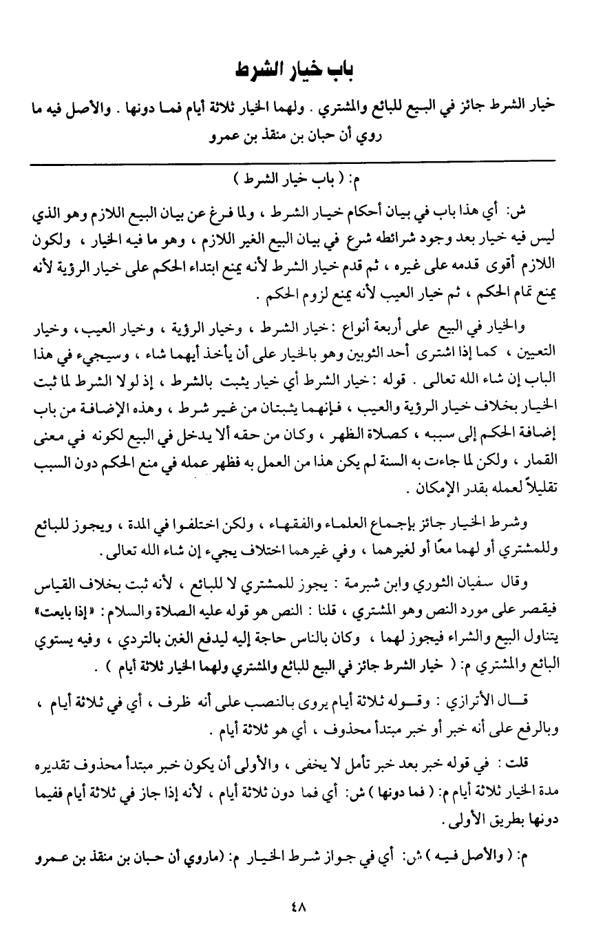 باب خيار الشرط خيار الشرط جائز في البيع للبائع والمشتري. ولهما الخيار ثلاثة أيام فما دونها، والأصل فيه ما روي أن حبان بن منقذ بن عمرو