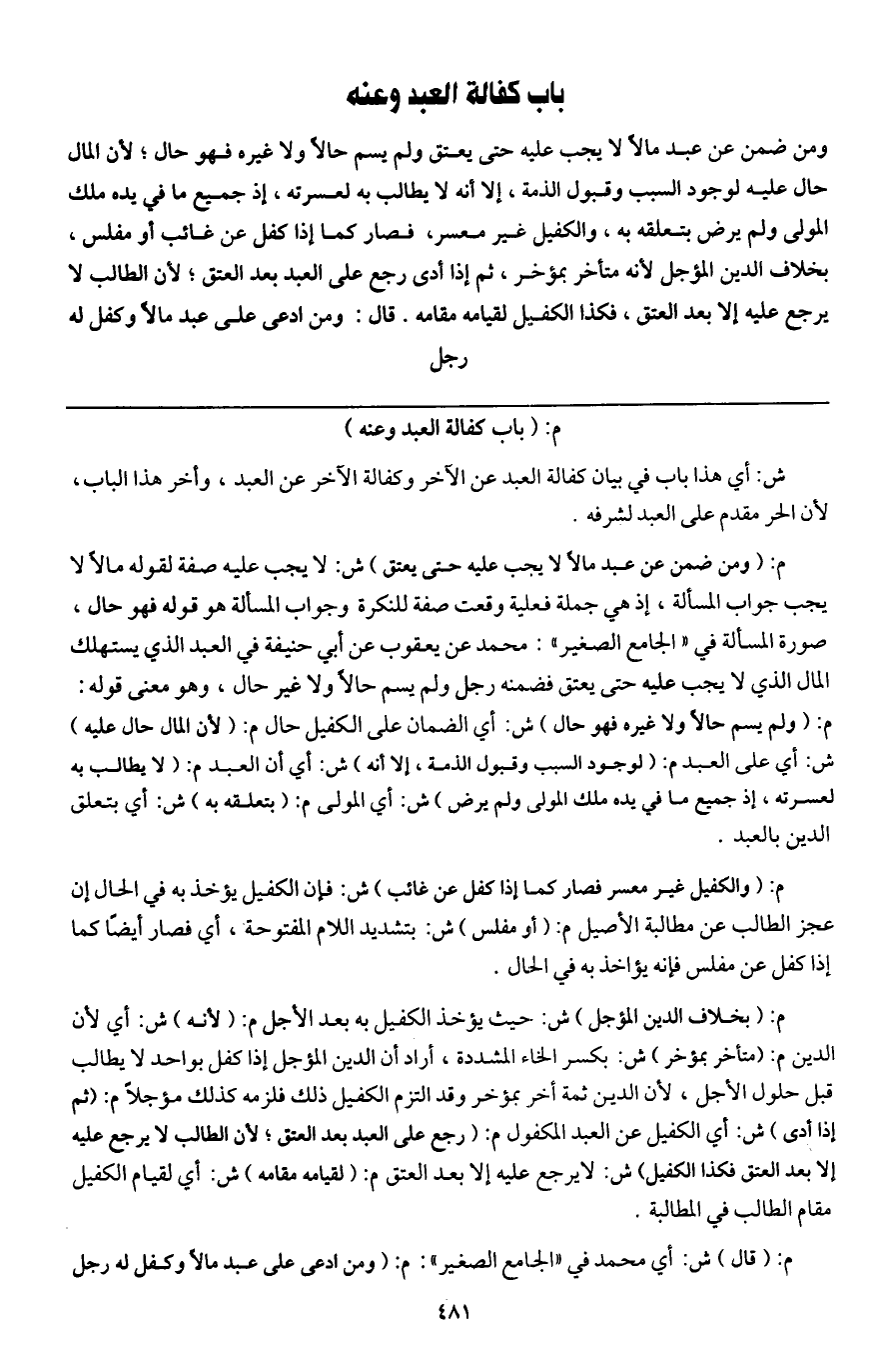 باب كفالة العبد وعنه ومن ضمن عن عبد مالا لا يجب عليه حتى يعتق ولم يسم حالا ولا غيره فهو حال؛ لأن المال حال عليه لوجود السبب وقبول الذمة، إلا أنه لا يطالب به لعسرته، إذ جميع ما في يده ملك المولى ولم يرض بتعلقه به، والكفيل غير معسر، فصار كما إذا كفل عن غائب أو مفلس، بخلاف الدين المؤجل لأنه متأخر بمؤخر، ثم إذا أدى رجع على العبد بعد العتق؛ لأن الطالب لا يرجع عليه إلا بعد العتق، فكذا الكفيل لقيامه مقامه. قال: ومن ادعى على عبد مالا وكفل له رجل