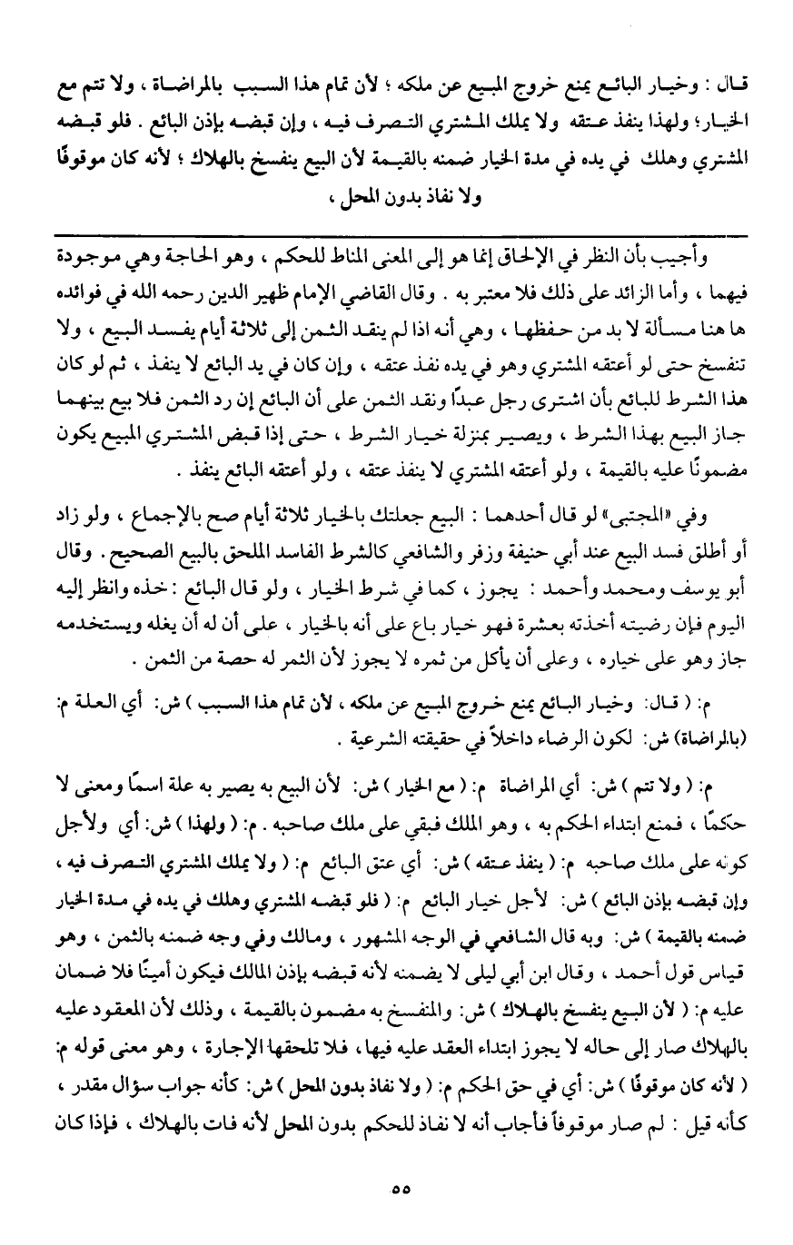 ـــــــــــــــــــــــــــــQوأجيب بأن النظر في الإلحاق إنما هو إلى المعنى المناط للحكم، وهو الحاجة وهي موجودة فيهما، وأما الزائد على ذلك فلا معتبر به. وقال القاضي الإمام ظهير الدين - رَحِمَهُ اللَّهُ - في فوائده: هاهنا مسألة لا بد من حفظها، وهي أنه إذا لم ينقد الثمن إلى ثلاثة أيام يفسد البيع، ولا تنفسخ حتى لو أعتقه المشتري وهو في يده نفذ عتقه، وإن كان في يد البائع لا ينفذ، ثم لو كان هذا الشرط للبائع بأن اشترى رجل عبدا ونقد الثمن على أن البائع إن رد الثمن فلا بيع بينهما جاز البيع بهذا الشرط، ويصير بمنزلة خيار الشرط، حتى إذا قبض المشتري المبيع يكون مضمونا عليه بالقيمة، ولو أعتقه المشتري لا ينفذ عتقه، ولو أعتقه البائع ينفذ.
