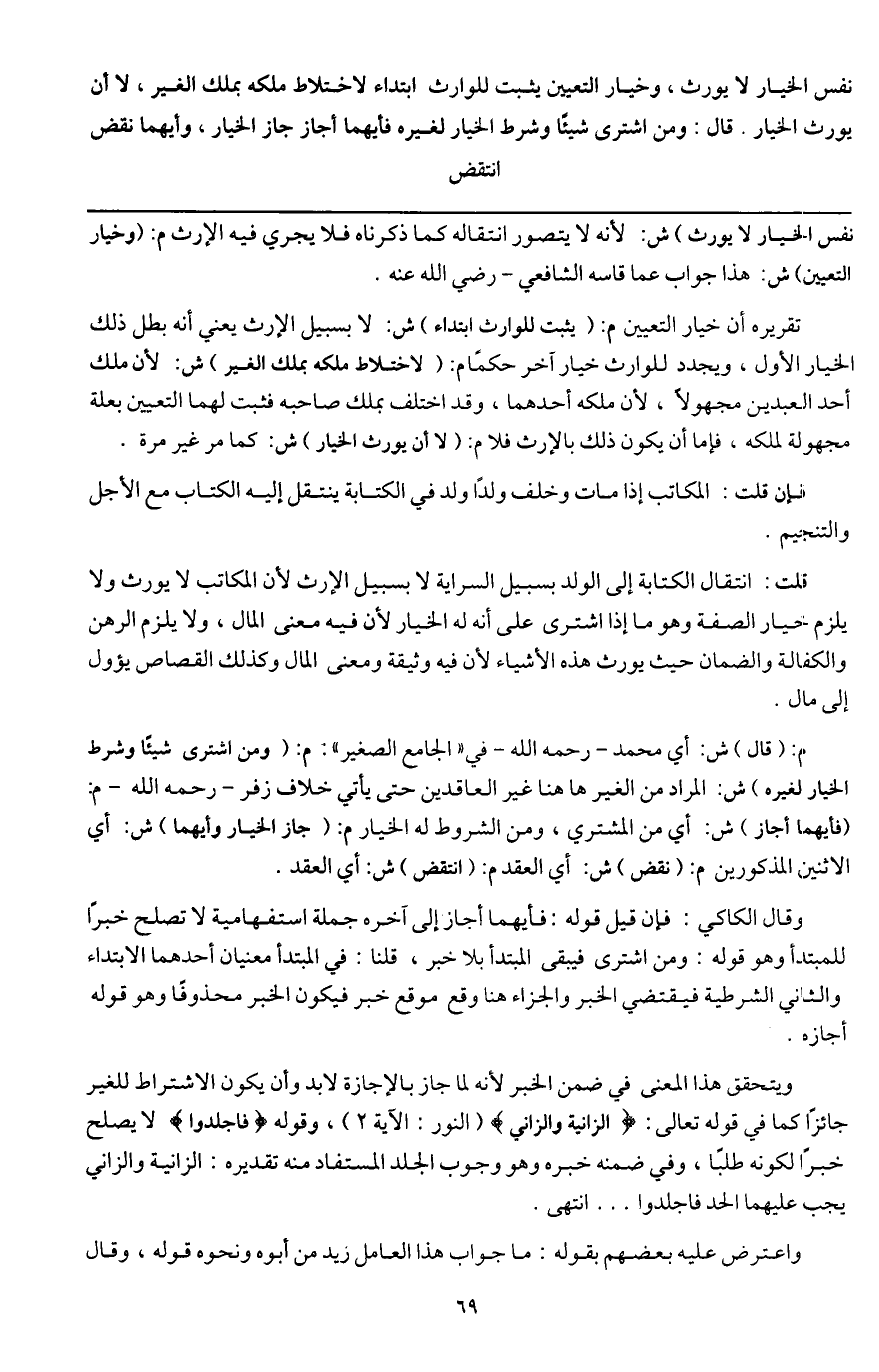 ويتحقق هذا المعنى في ضمن الخبر؛ لأنه لما جاز بالإجازة لا بد وأن يكون الاشتراط للغير جائزا كما في قَوْله تَعَالَى: {الزَّانِيَةُ وَالزَّانِي} [النور: 2] (النور: الآية 2) ، وقوله {فَاجْلِدُوا} [النور: 2] لا يصلح خبرا لكونه طلبا، وفي ضمنه خبره وهو وجوب الجلد المستفاد منه تقديره: الزانية والزاني يجب عليهما الحد فاجلدوا.... انتهى.