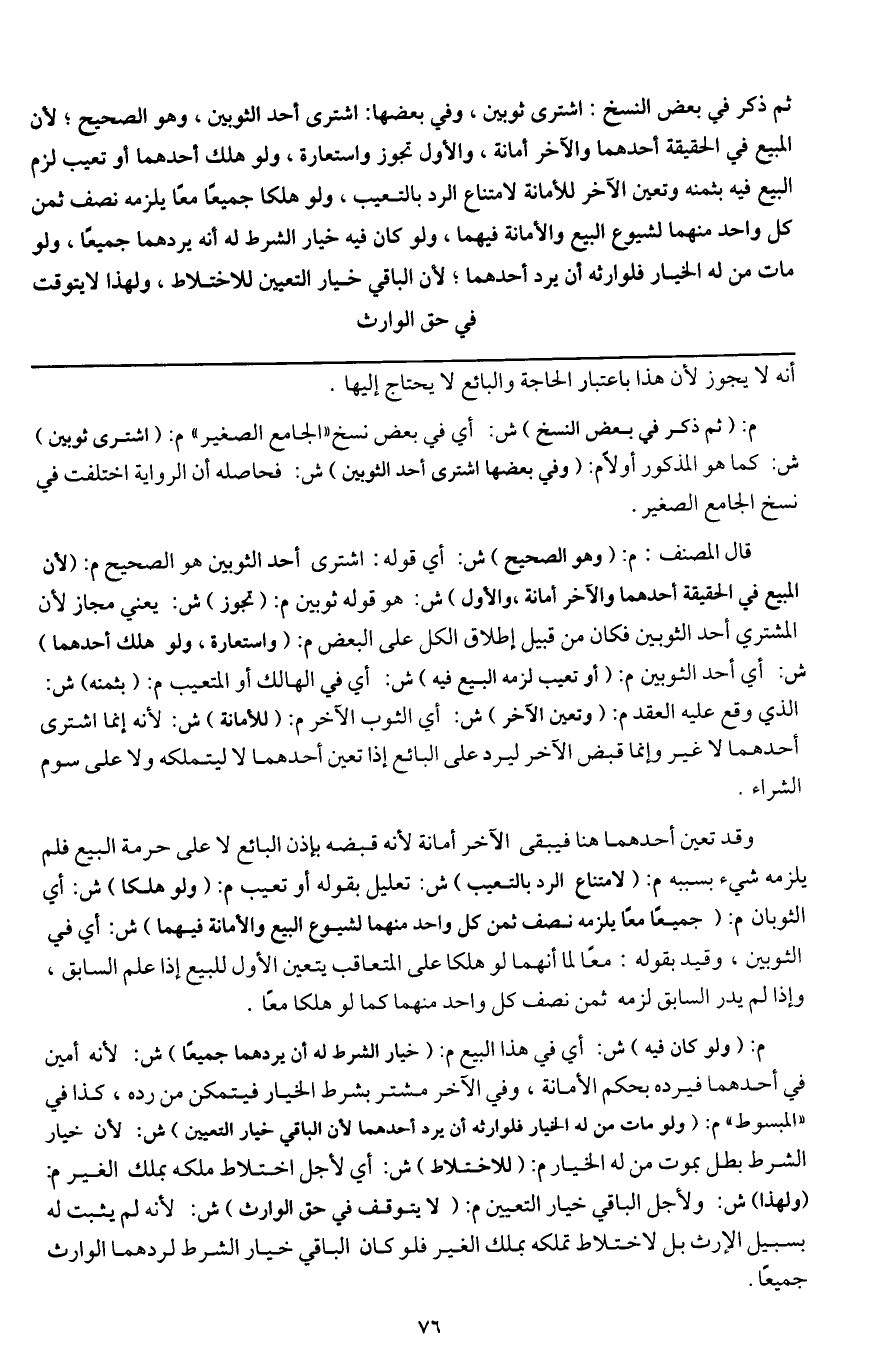 ثم ذكر في بعض النسخ: اشترى ثوبين، وفي بعضها: اشترى أحد الثوبين، وهو الصحيح؛ لأن المبيع في الحقيقة أحدهما والآخر أمانة، والأول تجوز واستعارة، ولو هلك أحدهما أو تعيب لزم البيع فيه بثمنه وتعين الآخر للأمانة؛ لامتناع الرد بالتعيب، ولو هلكا جميعا معا يلزمه نصف ثمن كل واحد منهما؛ لشيوع البيع والأمانة فيهما، ولو كان فيه خيار الشرط له أنه يردهما جميعا، ولو مات من له الخيار فلوارثه أن يرد أحدهما؛ لأن الباقي خيار التعيين للاختلاط، ولهذا لا يتوقت في حق الوارث