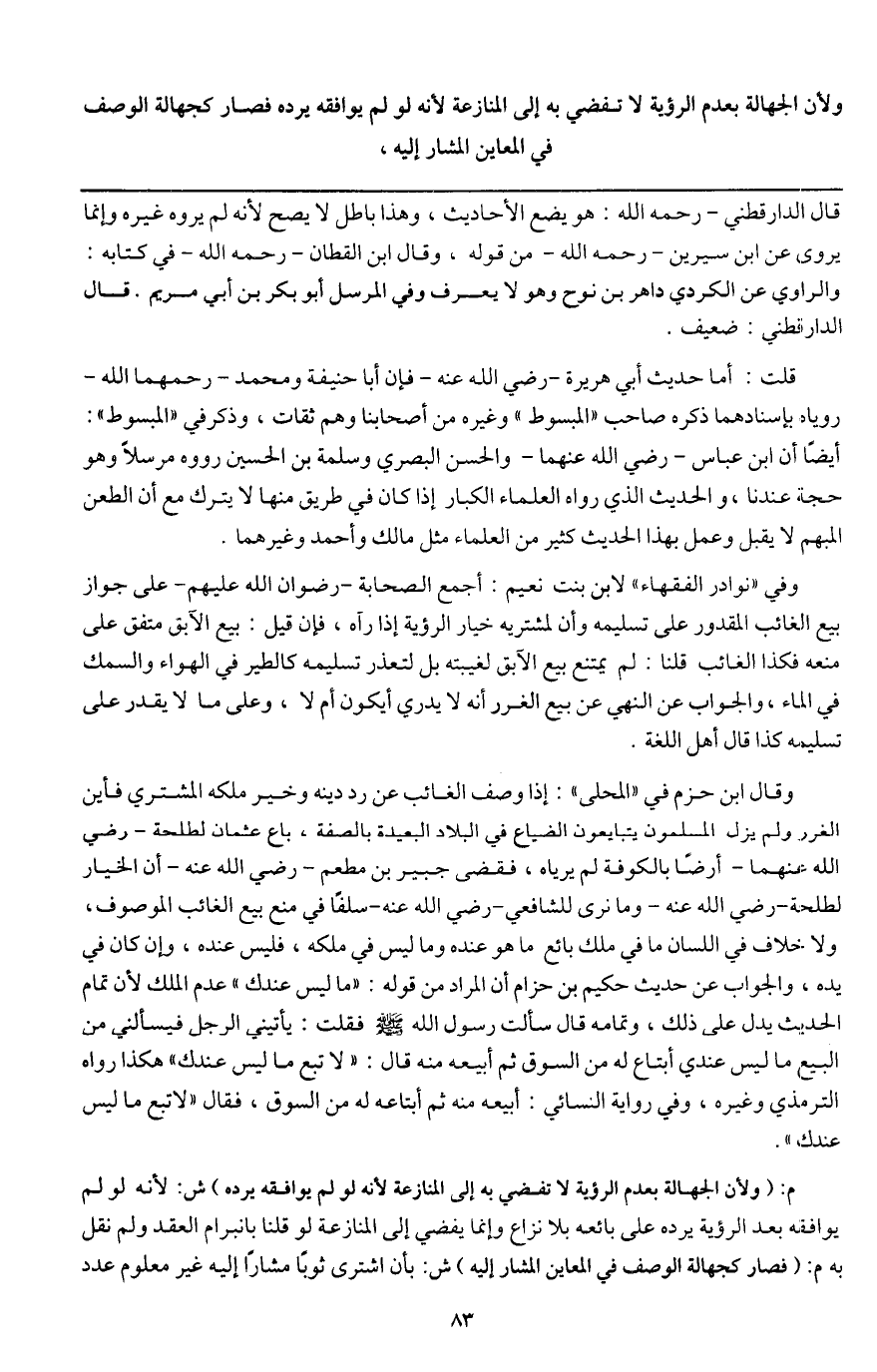 وقال ابن حزم في " المحلى ": إذا وصف الغائب عن رد دينه وخير ملكه المشتري فأين الغرر ولم يزل المسلمون يتبايعون الضياع في البلاد البعيدة بالصفة، باع عثمان لطلحة - رَضِيَ اللَّهُ عَنْهُمَا - أرضا بالكوفة لم يرياه، فقضى جبير بن مطعم - رَضِيَ اللَّهُ عَنْهُ - أن الخيار لطلحة - رَضِيَ اللَّهُ عَنْهُ - وما نرى للشافعي - رَضِيَ اللَّهُ عَنْهُ - سلفا في منع بيع الغائب الموصوف، ولا خلاف في اللسان ما في ملك بائع ما هو عنده، وما ليس في ملكه فليس عنده، وإن كان في يده، والجواب عن حديث حكيم بن حزام أن المراد من قوله: "ما ليس عندك" عدم الملك؛ لأن تمام الحديث يدل على ذلك، وتمامه قال: «سألت رسول الله - صَلَّى اللَّهُ عَلَيْهِ وَسَلَّمَ - فقلت: يأتيني الرجل فيسألني من البيع ما ليس عندي أبتاع له من السوق ثم أبيعه منه؟ قال: "لا تبع ما ليس عندك» هكذا رواه الترمذي وغيره، وفي رواية النسائي: أبيعه منه ثم أبتاعه له من السوق؟ فقال «لا تبع ما ليس عندك» .