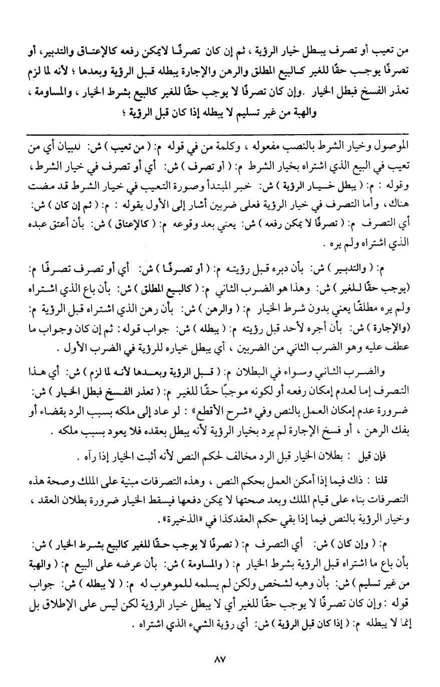 من تعيب أو تصرف يبطل خيار الرؤية، ثم إن كان تصرفا لا يمكن رفعه كالإعتاق والتدبير، أو تصرفا يوجب حقا للغير كالبيع المطلق والرهن والإجارة يبطله قبل الرؤية وبعدها؛ لأنه لما لزم تعذر الفسخ فبطل الخيار. وإن كان تصرفا لا يوجب حقا للغير كالبيع بشرط الخيار، والمساومة، والهبة من غير تسليم لا يبطله إذا كان قبل الرؤية؛